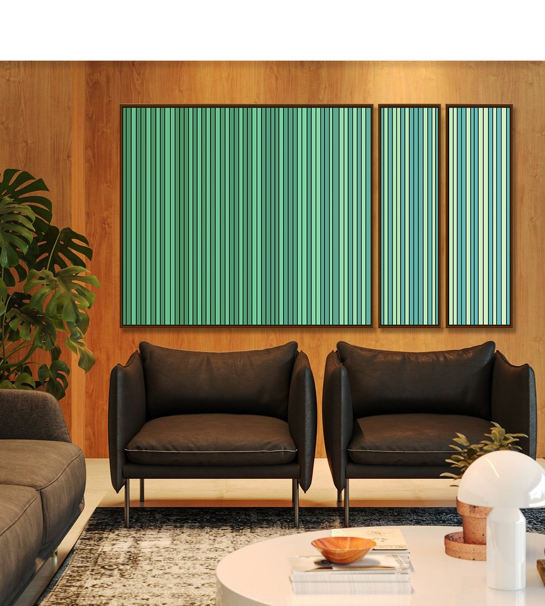 Com listras e degradê em verde turquesa, este Trio de Quadros Estilizados transmite equilíbrio, movimento e estilo.
