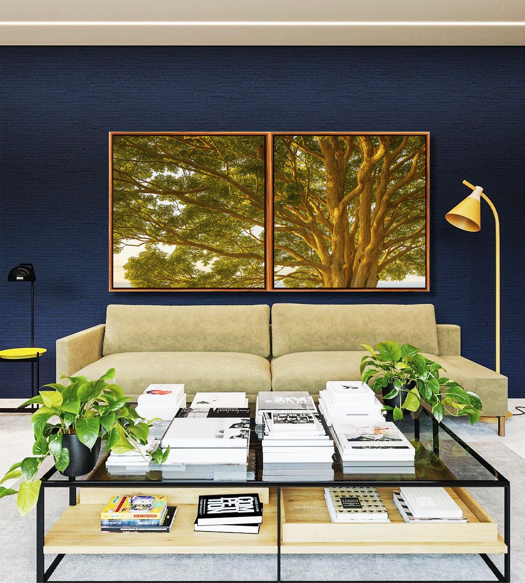 A combinação do verde luminoso das folhas com o brilho do sol torna este Duo de Quadros Quadrados uma peça acolhedora e inspiradora. Ideal para salas, quartos ou escritórios que buscam beleza natural, profundidade e um toque refinado de paisagem.