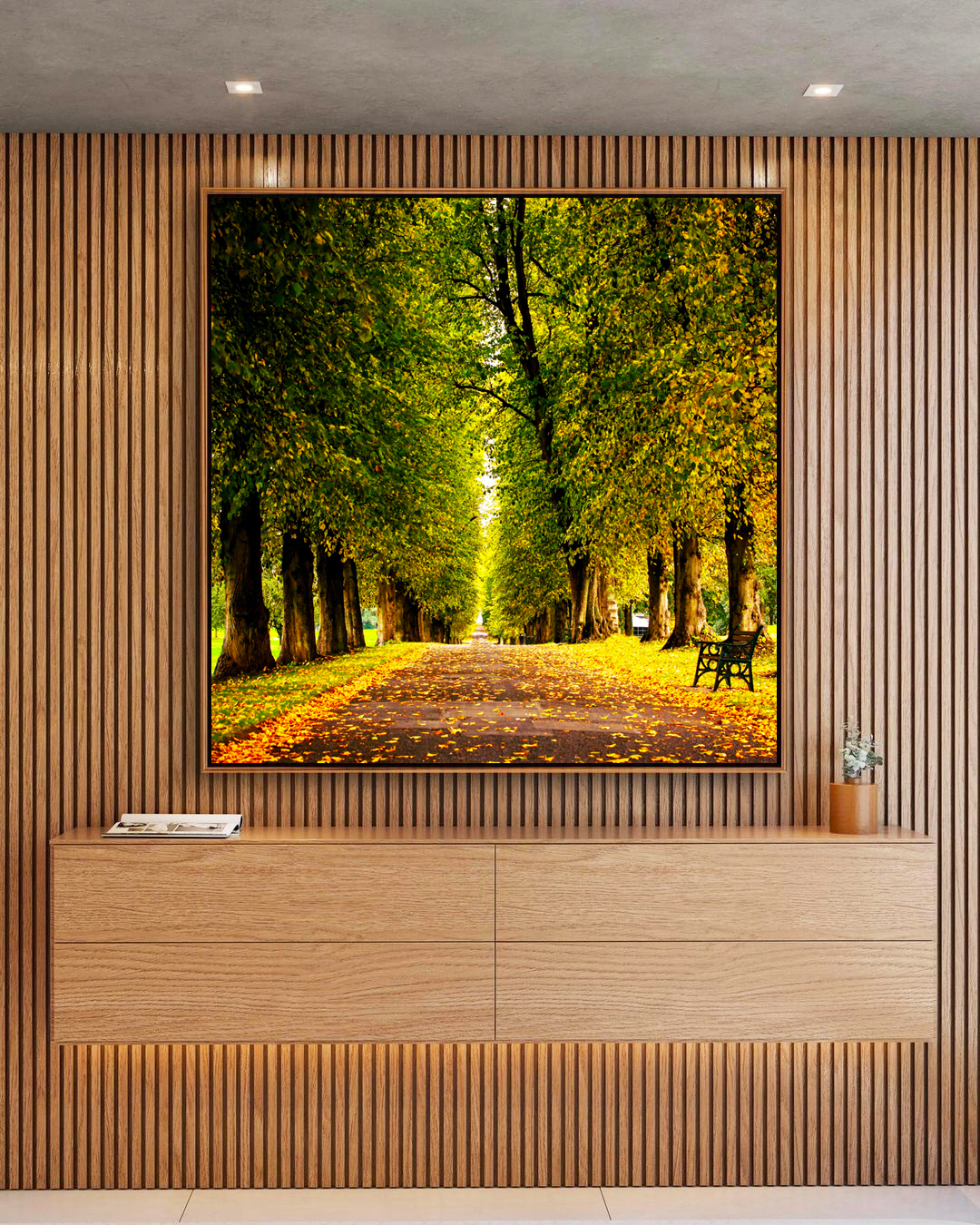 Traga tranquilidade e beleza ao seu ambiente com este Quadro Quadrado de estrada, árvores e banco. Perfeito para escritórios, salas ou espaços serenos. Impressão em canvas premium com moldura elegante, criando uma atmosfera relaxante e natural.