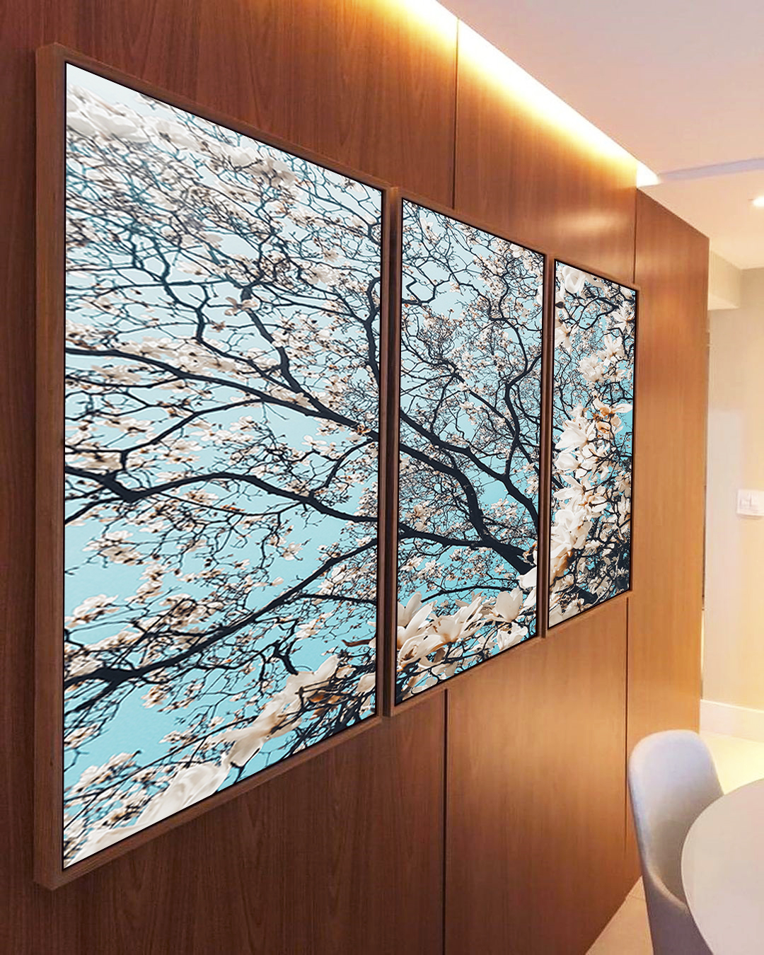 Trio de Quadros Árvore Flores Brancas Céu Azul Claro Natureza Paisagem Canvas Moldura