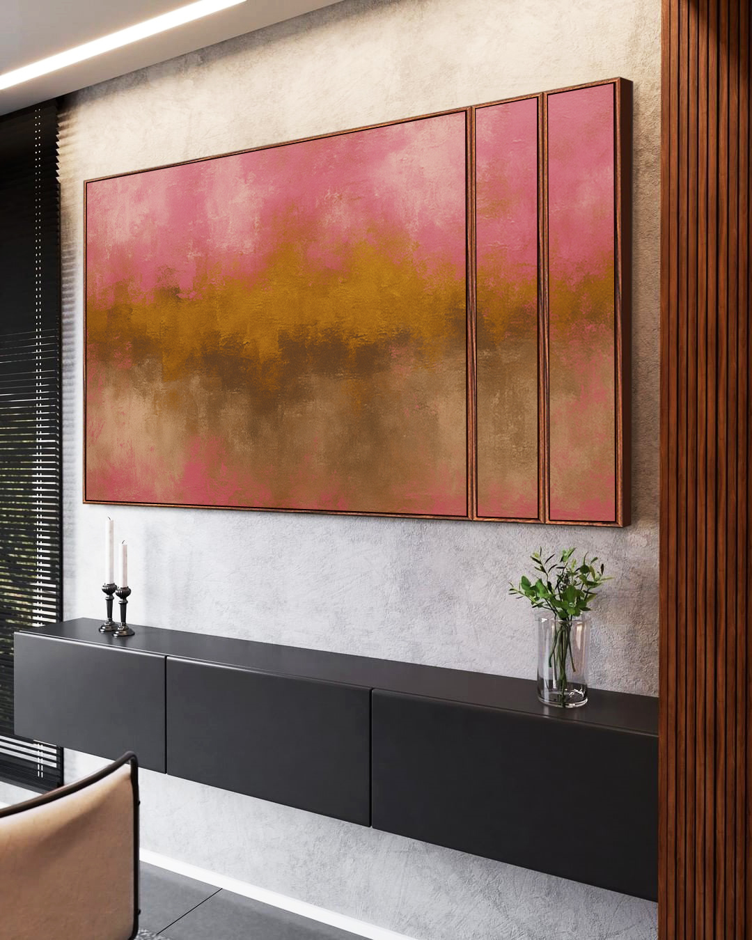 Elegante e marcante, este Trio de Quadros Estilizados com tons de rosa, dourado e marrom cria um ponto focal sofisticado no ambiente. Ideal para compor salas refinadas, quartos estilosos, escritórios elegantes ou halls de entrada imponentes.