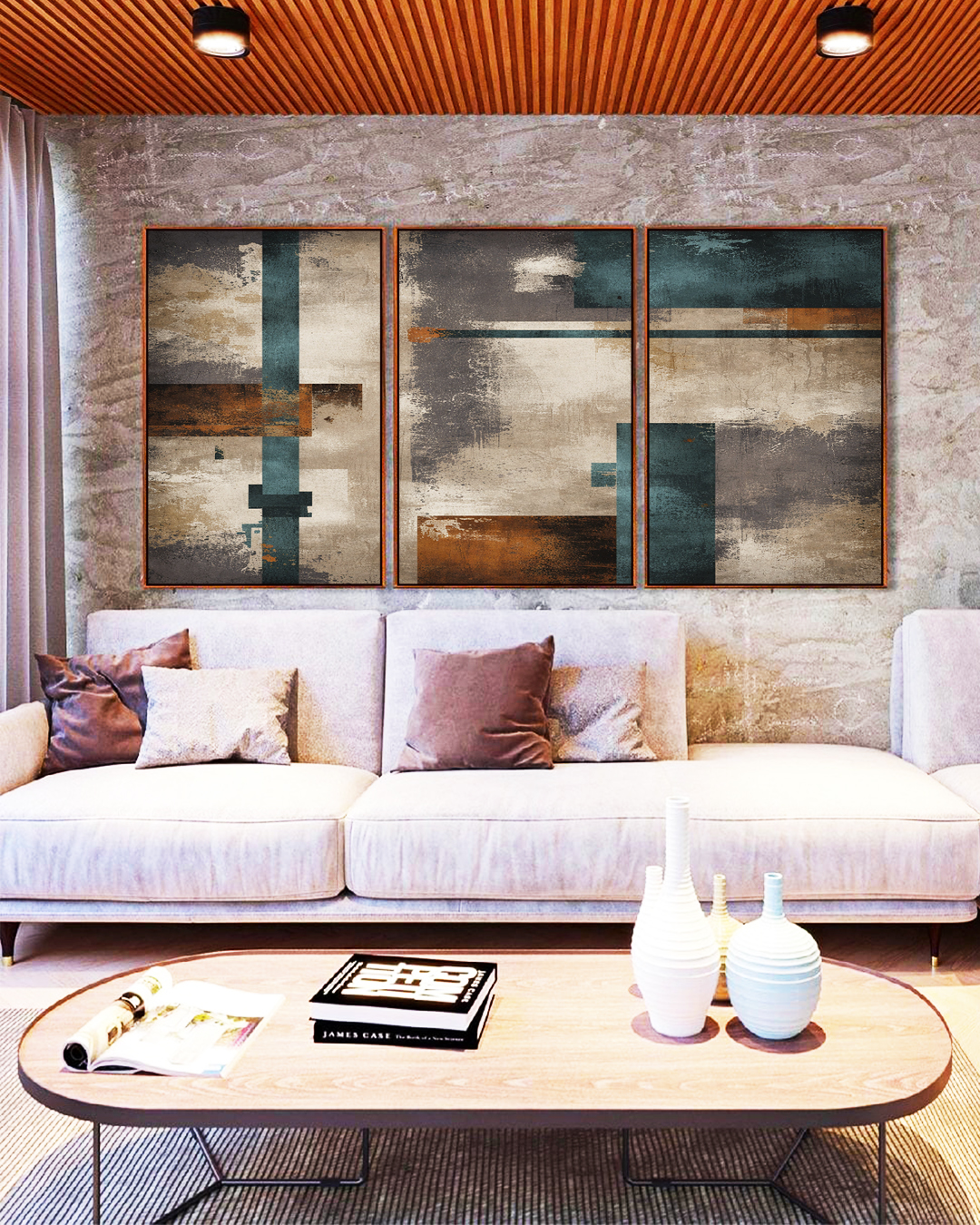 Arte abstrata com tons de azul, bronze e cinza concreto, trazendo um visual urbano e sofisticado. Ideal para salas, escritórios e ambientes modernos que buscam personalidade e elegância na decoração.