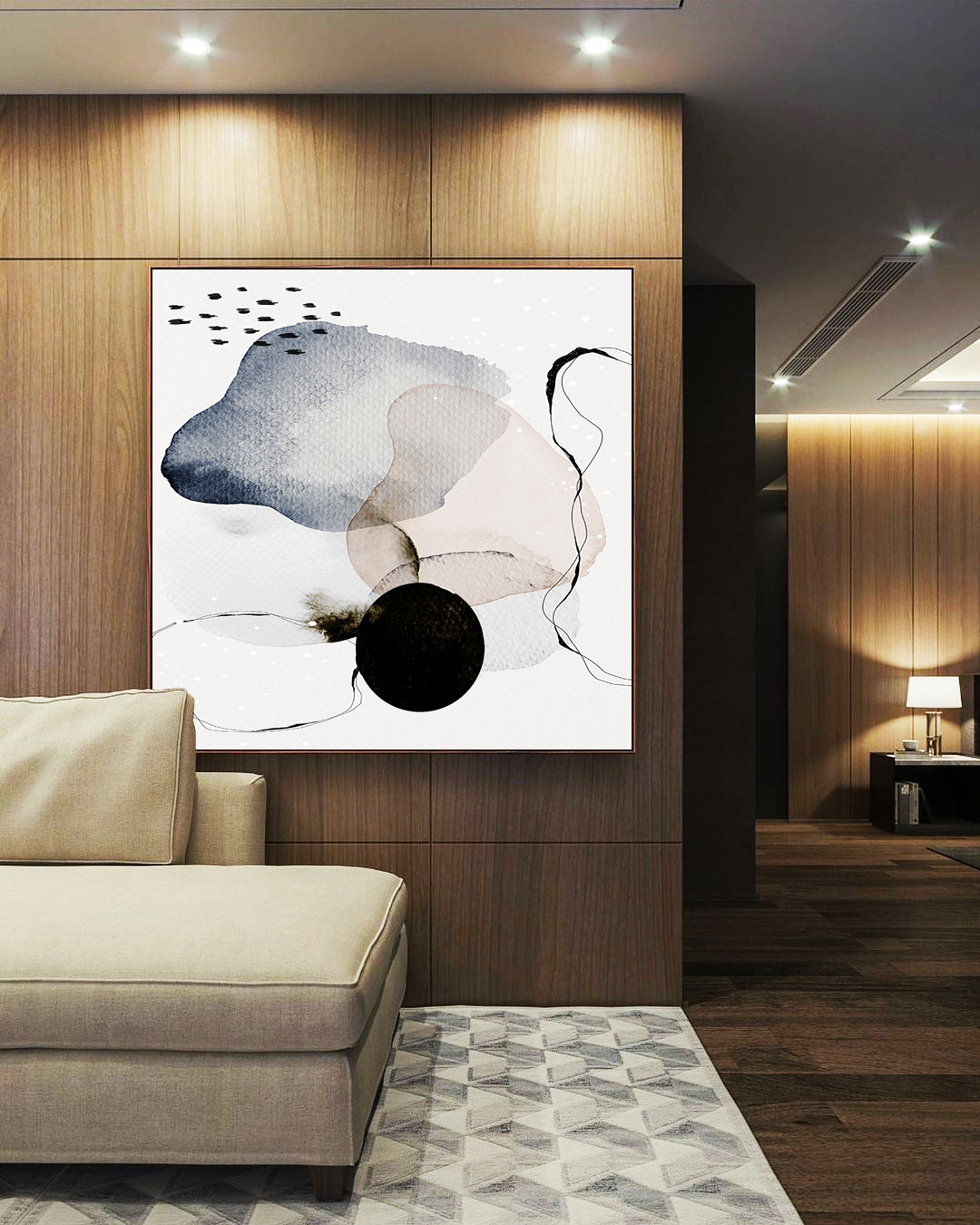 Obra minimalista que mistura azul, rosa e preto em composição escandinava refinada. A moldura extra fina flutuante amplia a sensação de leveza. Ideal para sala de estar, quarto ou escritório, garantindo modernidade e estilo.