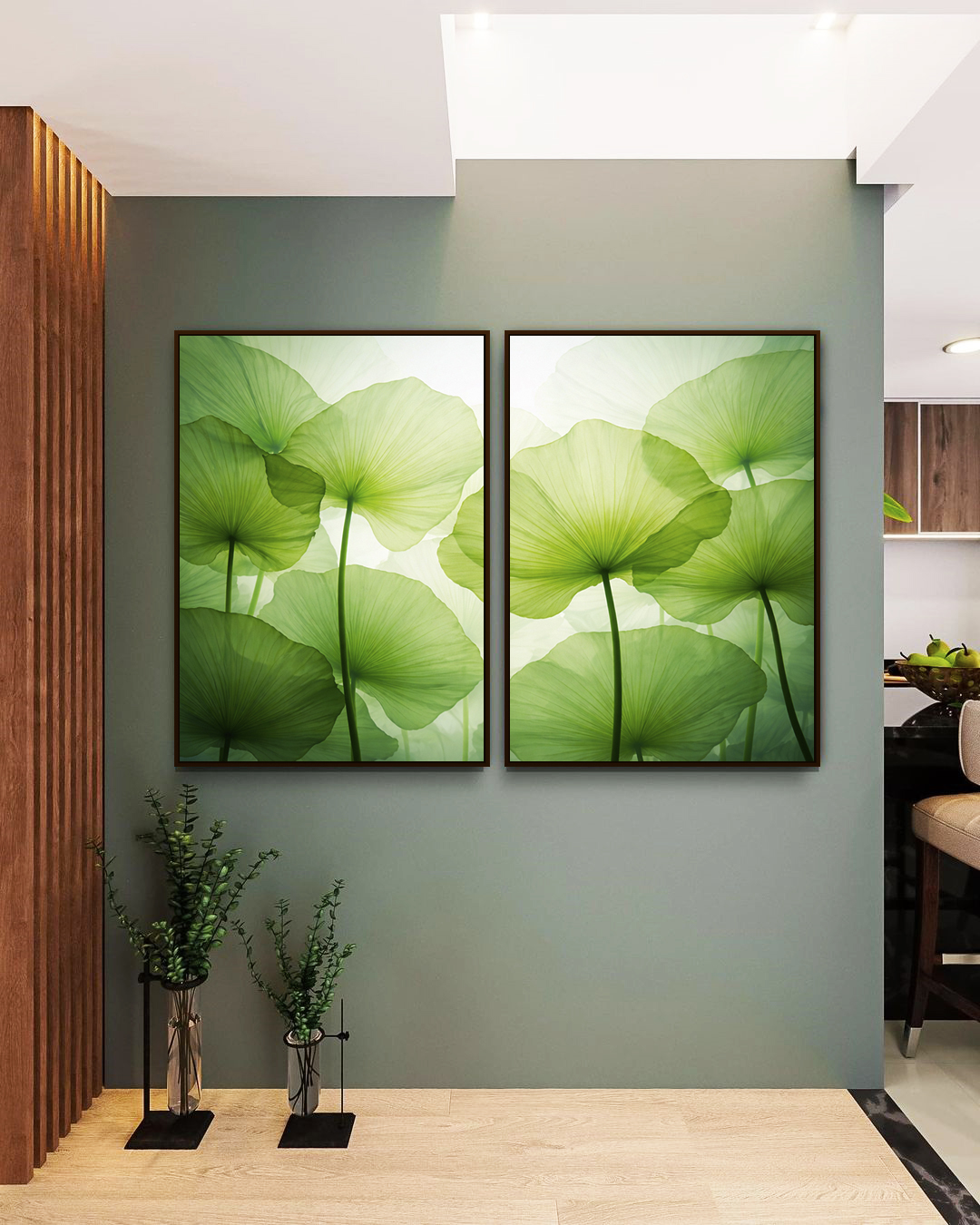 Folhas de lótus em verde suave, trazendo leveza e tranquilidade inspirada na natureza aquática. Ideal para sala, quarto ou espaços de descanso que pedem harmonia e serenidade.