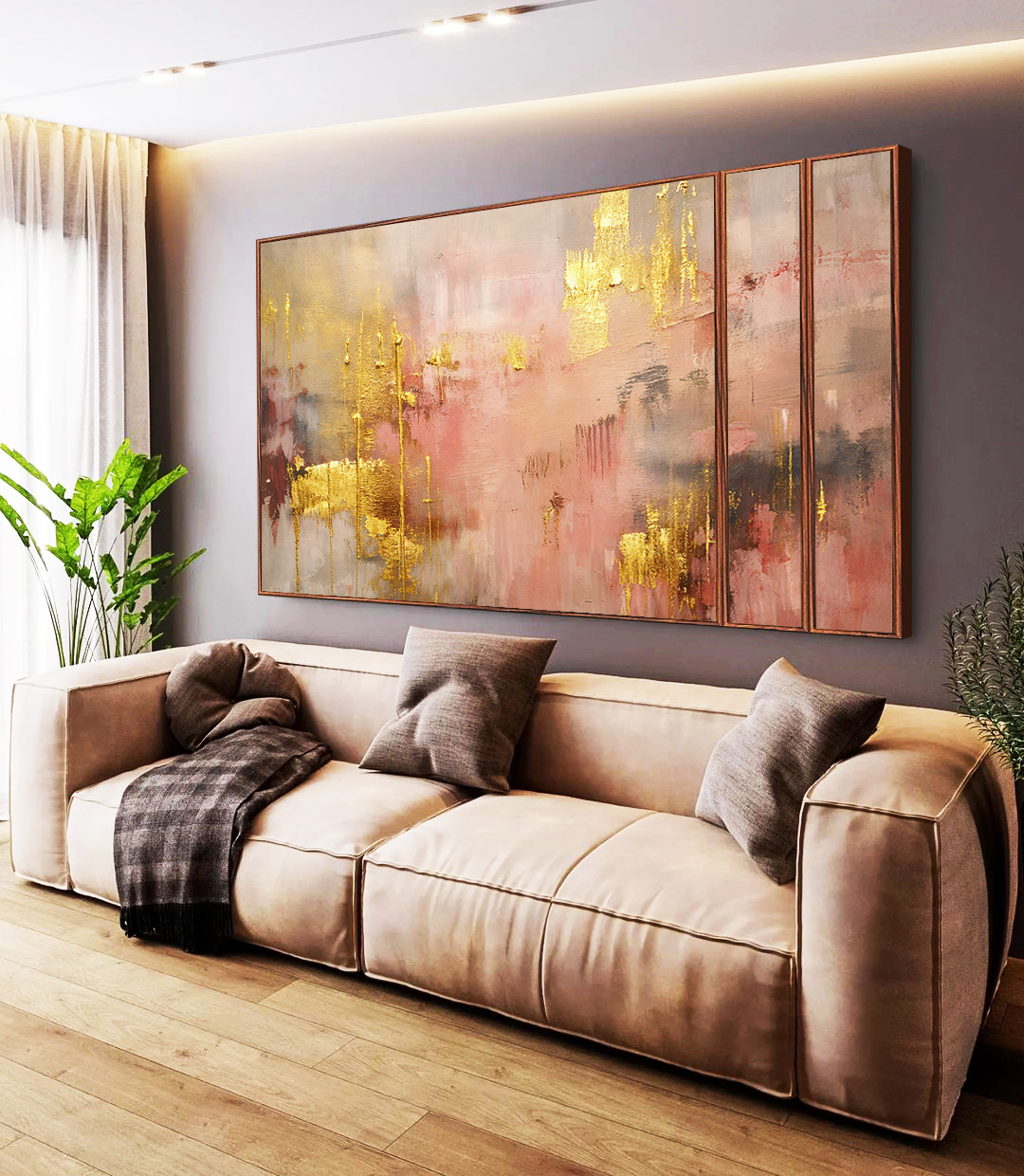 Nuances de rosa e dourado sobre base cinza, transmitindo luxo sutil e delicadeza. Combinação perfeita para quem busca um toque moderno e feminino. Excelente para salas e quartos com estilo contemporâneo e sofisticado.