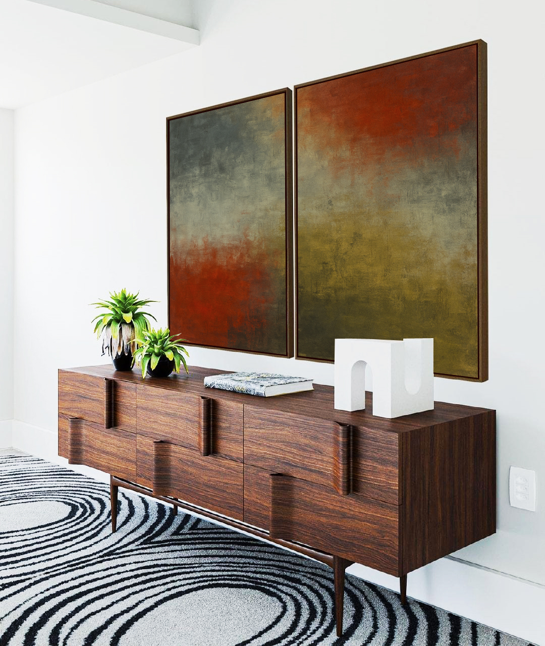 O Duo de Quadros em verde oliva, vermelho carmim e azul acinzentado adiciona charme e estilo contemporâneo. Com moldura flutuante, transforma sua sala, quarto, hall ou escritório em um espaço moderno, elegante e cheio de personalidade.