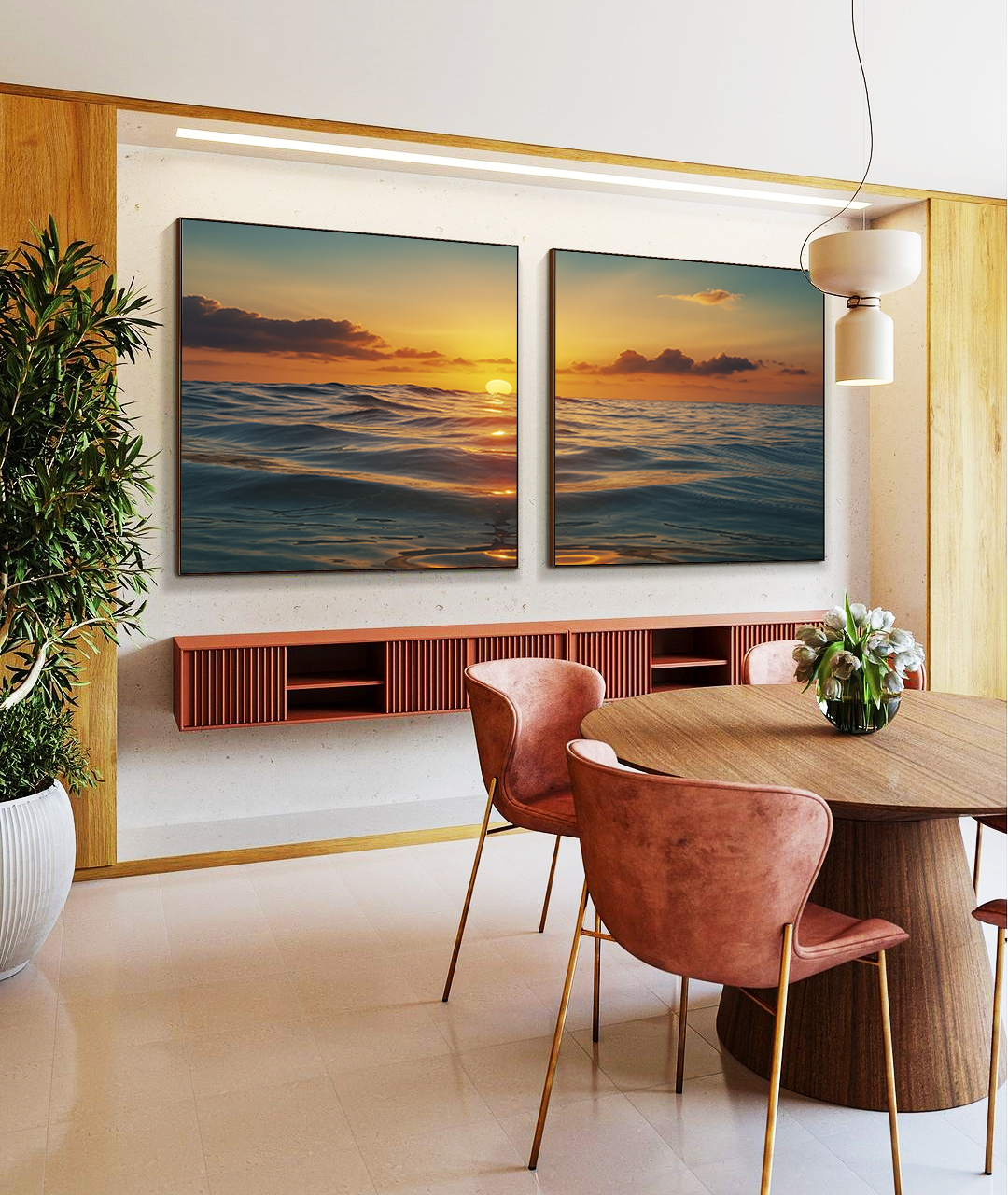 Inspirador e sofisticado, este Duo de Quadros Quadrados combina o brilho do pôr do sol dourado com a tranquilidade do mar azul calmo. A escolha certa para salas modernas, quartos elegantes, escritórios profissionais ou halls de entrada imponentes.