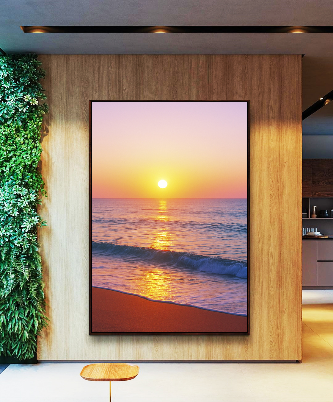 O encontro do mar azul com o céu rosa ao pôr do sol neste Quadro Vertical transmite calma e encantamento. Ideal para valorizar sua sala, quarto ou hall de entrada com sofisticação e um toque de natureza. Elegância e Harmonia Visual.