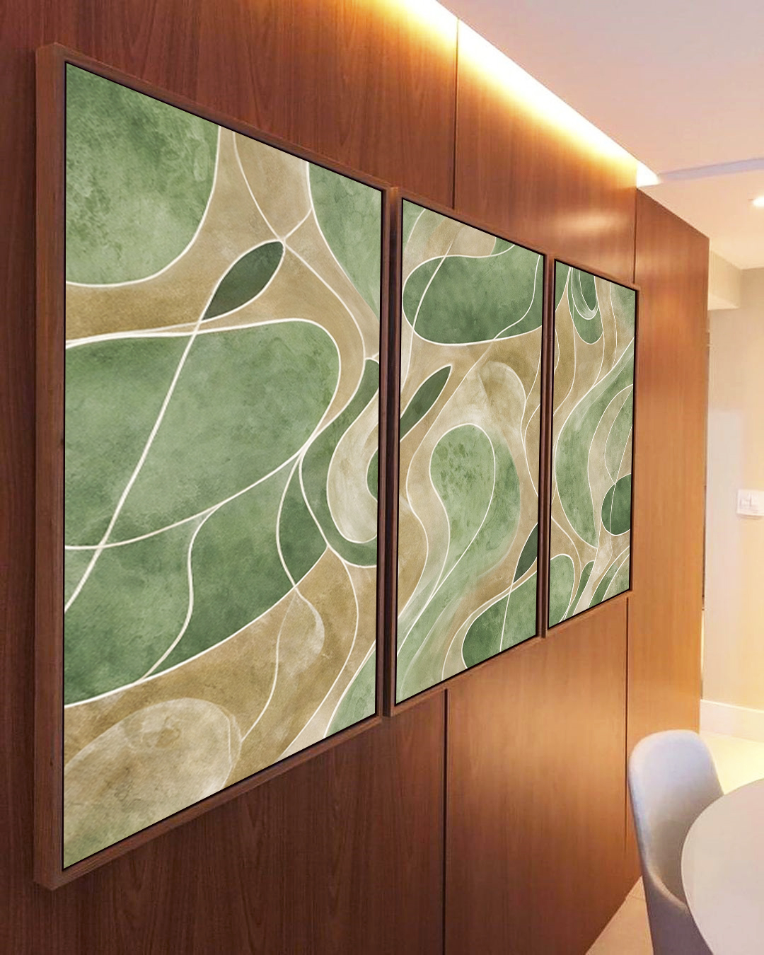 Elegante e sereno, este Trio de Quadros em tons de verde e marfim em contornos suaves cria harmonia visual e sofisticação atemporal no décor. A escolha ideal para salas refinadas, quartos elegantes ou escritórios contemporâneos.