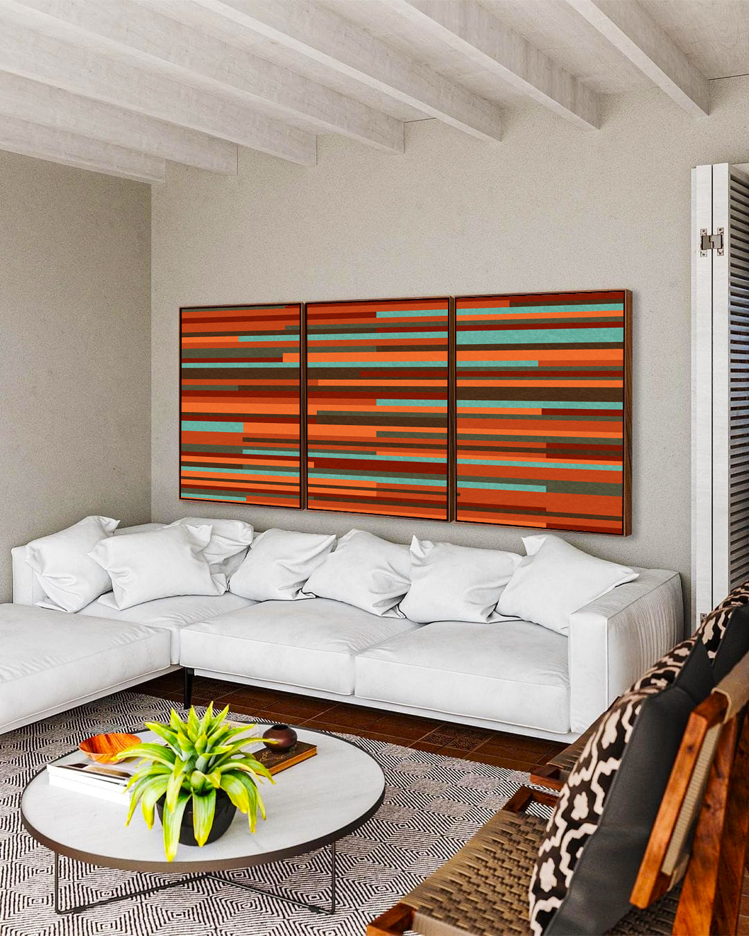 Transforme seu ambiente com este Trio de Quadros abstratos, com mosaico de listras nas cores laranja, verde e turquesa. Ideal para salas e escritórios modernos. Produzidos em canvas de alta qualidade com moldura resistente, trazendo estilo e sofisticação.