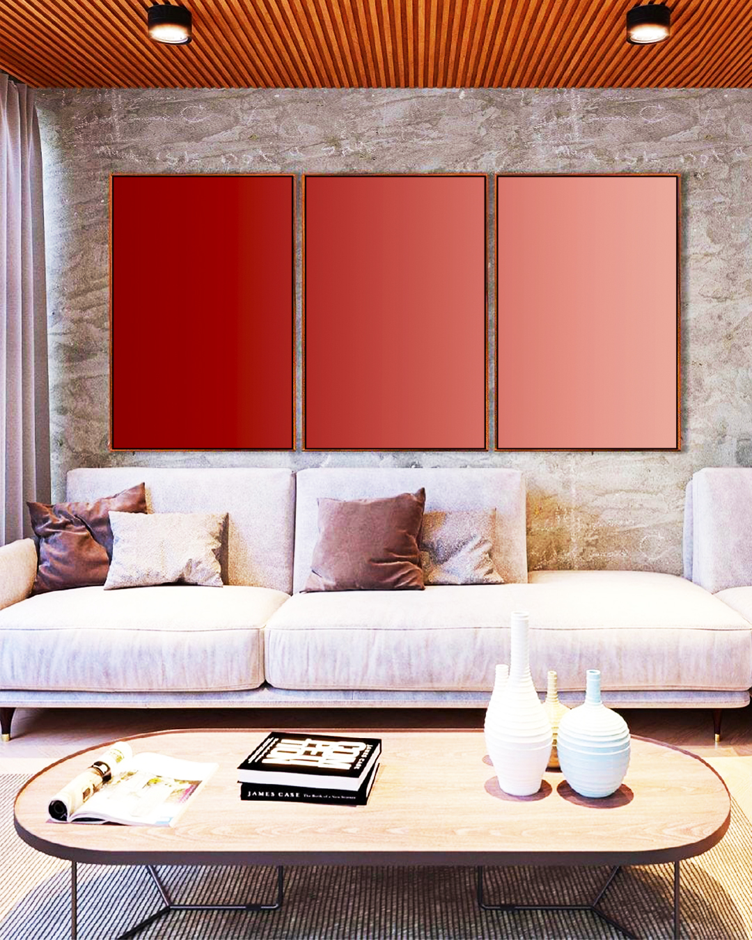 Este Trio de Quadros Abstrato traz harmonia e impacto visual com degradê em vermelho carmim, rosa e salmão. Com moldura moderna, é a escolha certa para salas de estar, halls de entrada e escritórios que pedem um toque sofisticado e elegante.