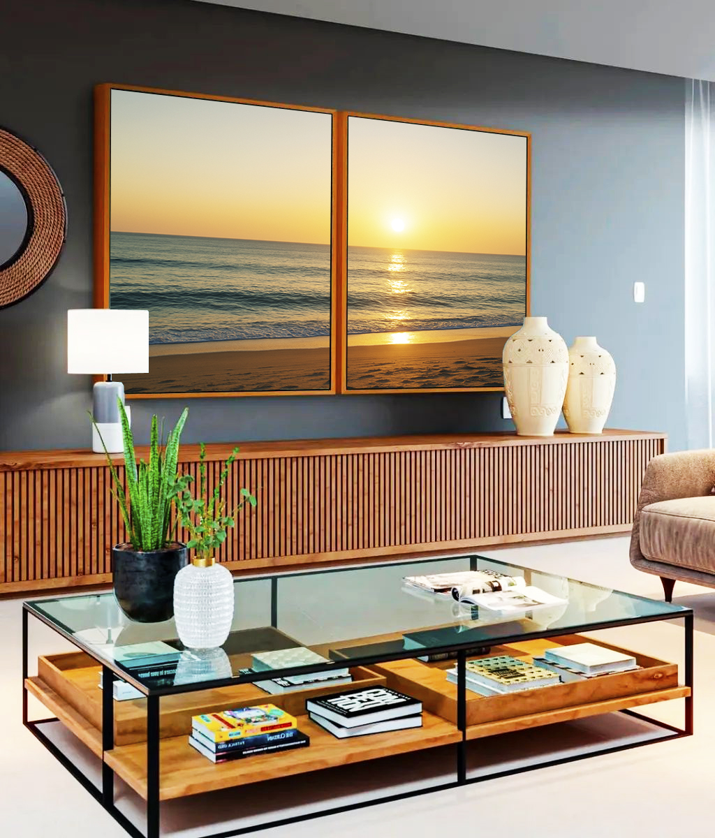 O brilho suave do sol sobre o mar prateado neste Duo de Quadros transforma o ambiente com leveza e elegância. A escolha certa para valorizar salas, quartos ou halls de entrada com uma paisagem de praia moderna, calma e inspiradora.
