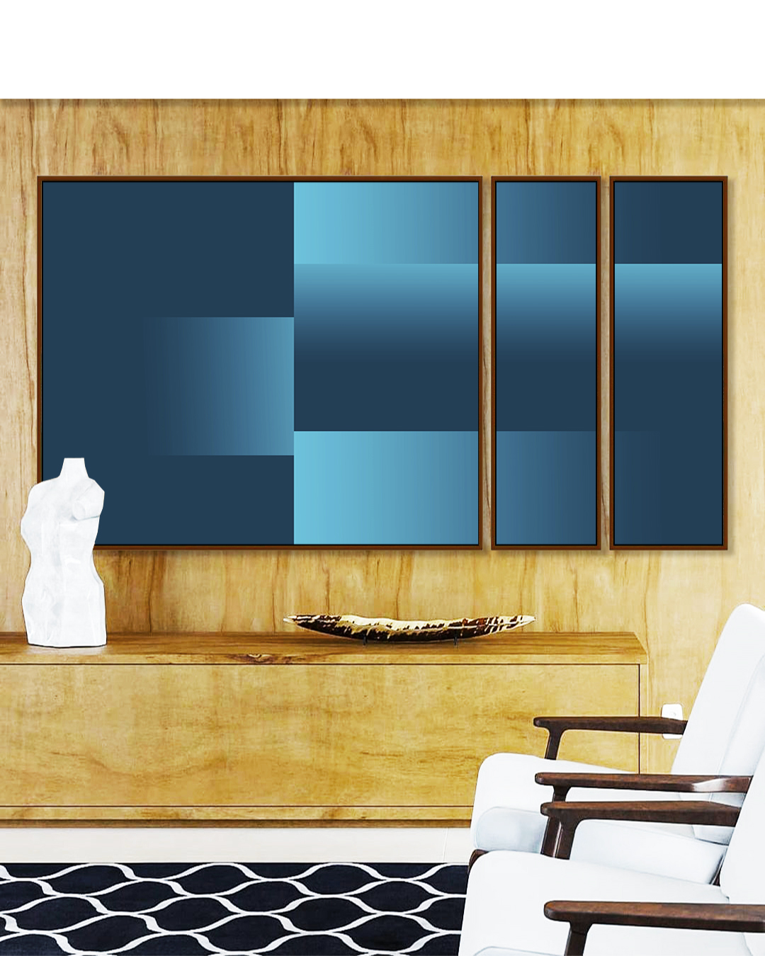 Com Arte geométrica e degradê em tons de azul, este Trio de Quadros Estilizados transmite modernidade e serenidade. A escolha certa para salas amplas, quartos refinados ou halls de entrada, valorizando o ambiente com arte abstrata e visual marcante.
