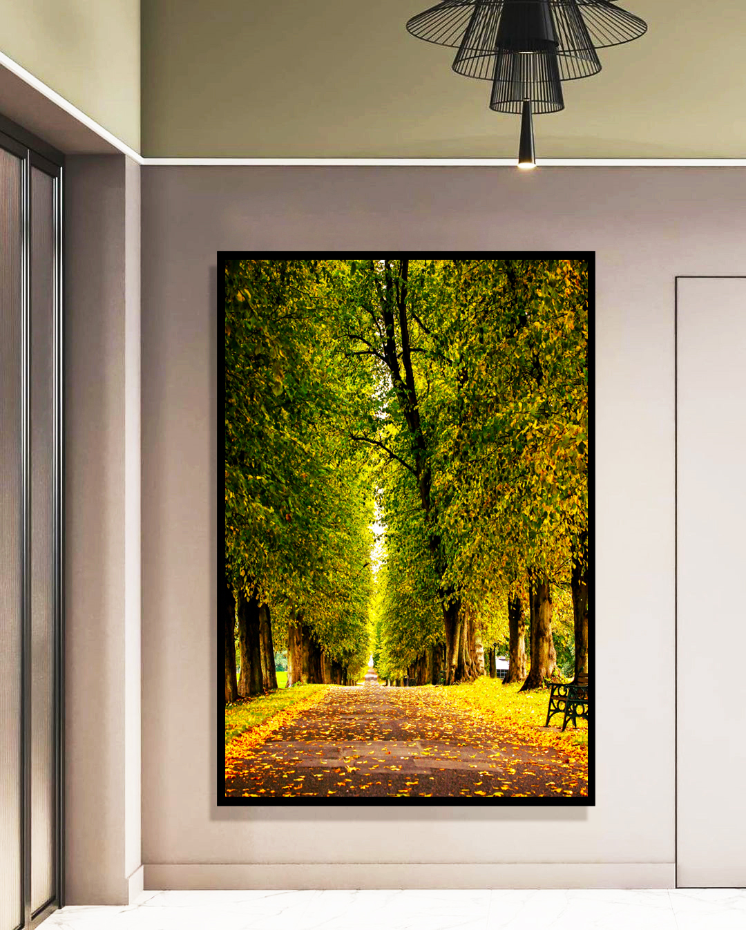 Acrescente elegância e serenidade ao seu ambiente com este Quadro Vertical de estrada, árvores e banco. Perfeito para escritórios, salas ou espaços de meditação. Impressão em canvas de alta qualidade com moldura sofisticada e moderna.