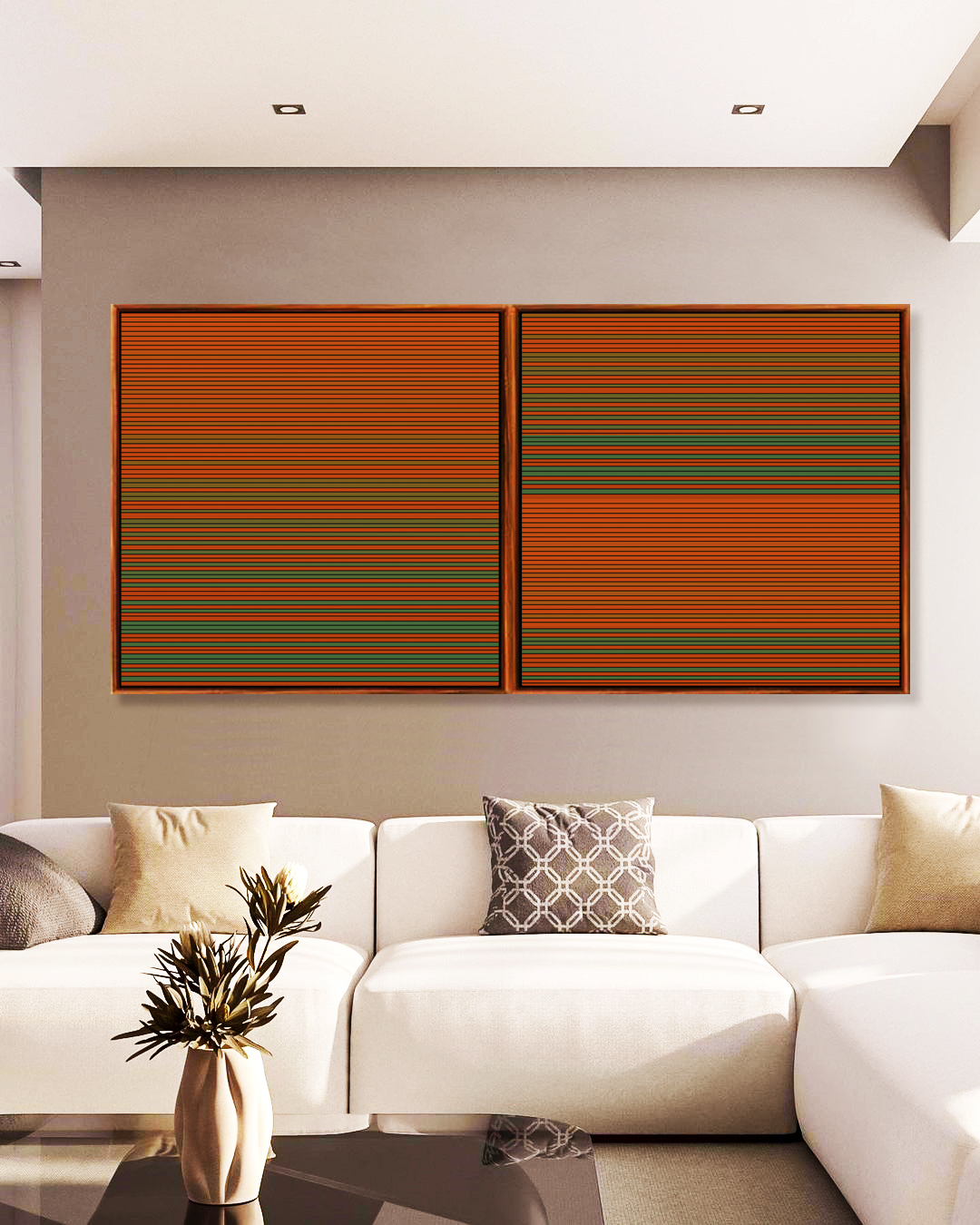 Moderno e expressivo, este Duo de Quadros Quadrados com degradê em tons de laranja coral e verde transmite energia equilibrada e sofisticação. Ideal para valorizar salas modernas, quartos elegantes, escritórios criativos.