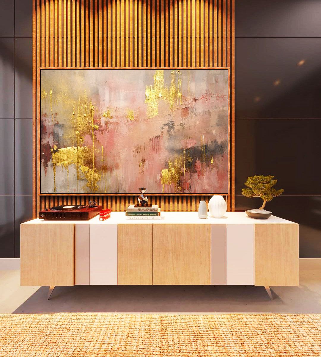 Nuances de rosa e dourado sobre base cinza, transmitindo luxo sutil e delicadeza. Combinação perfeita para quem busca um toque moderno e feminino. Excelente para salas e quartos com estilo contemporâneo e sofisticado.
