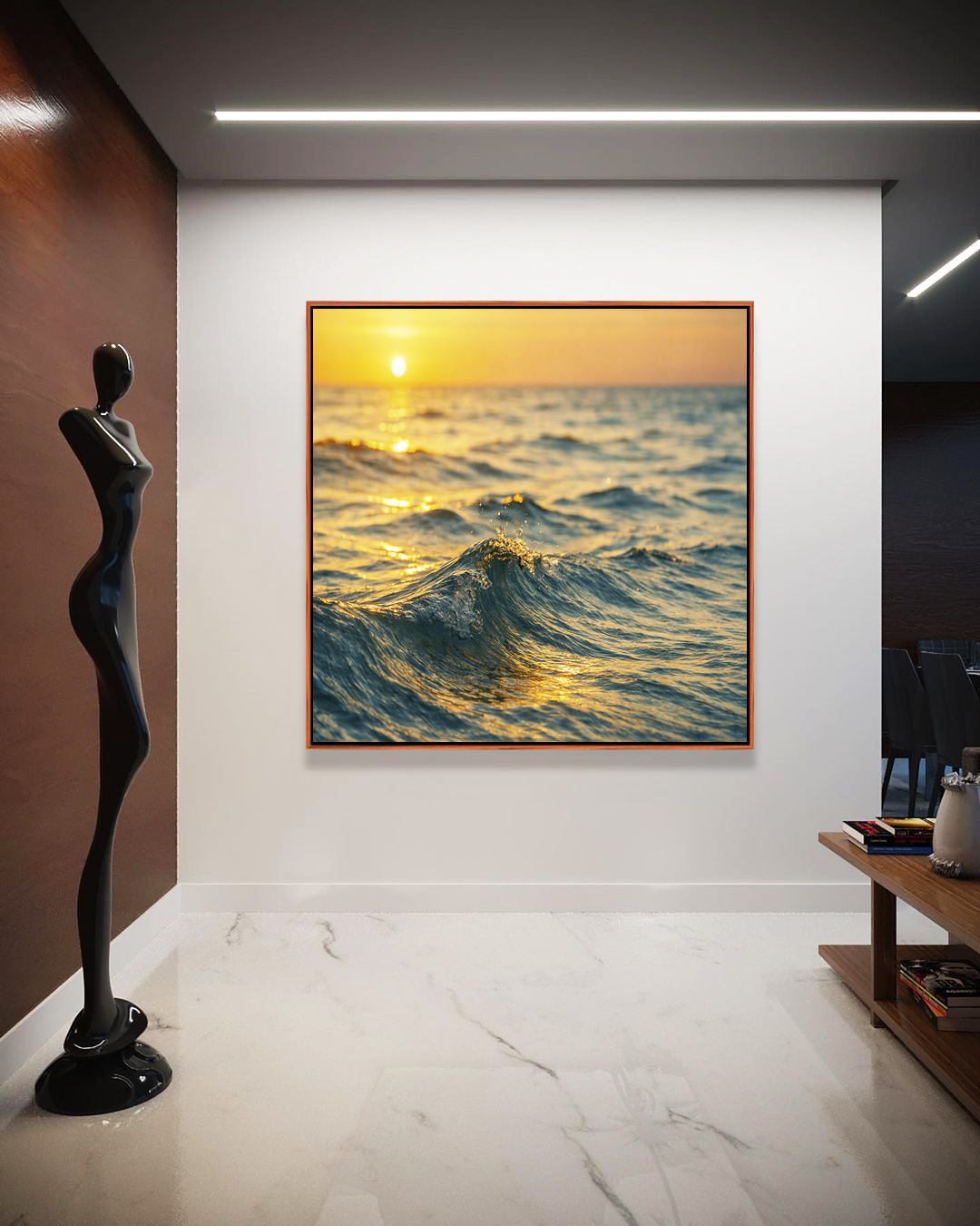 Pôr do sol sobre o mar com ondas suaves e brilho prateado que transmite paz e elegância. Ideal para sala de estar, quarto, escritório, consultório ou casa de praia. Perfeito para decoração litorânea, estilo contemporâneo e ambientes relaxantes.