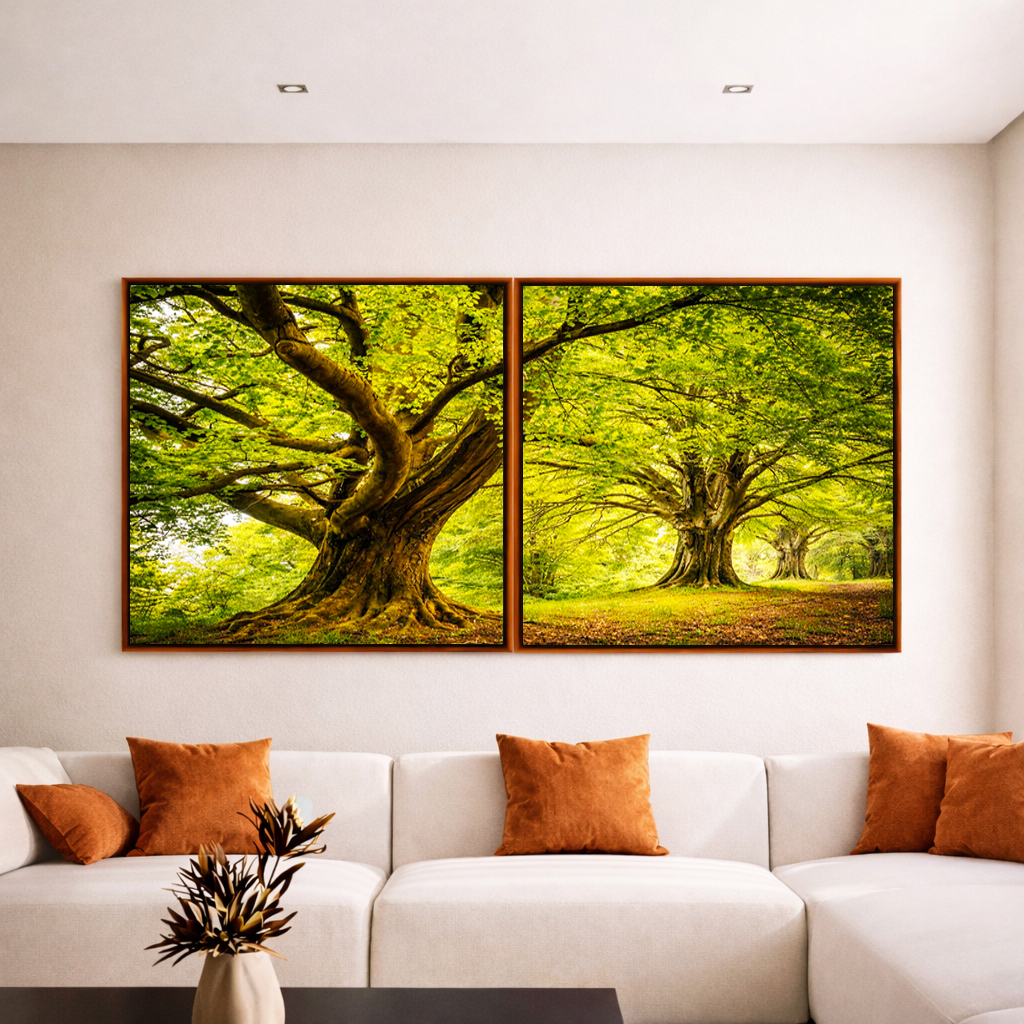 Duo de Quadros Quadrados Árvores Em Floresta Natureza Folhas Claridade Natureza Canvas Moldura