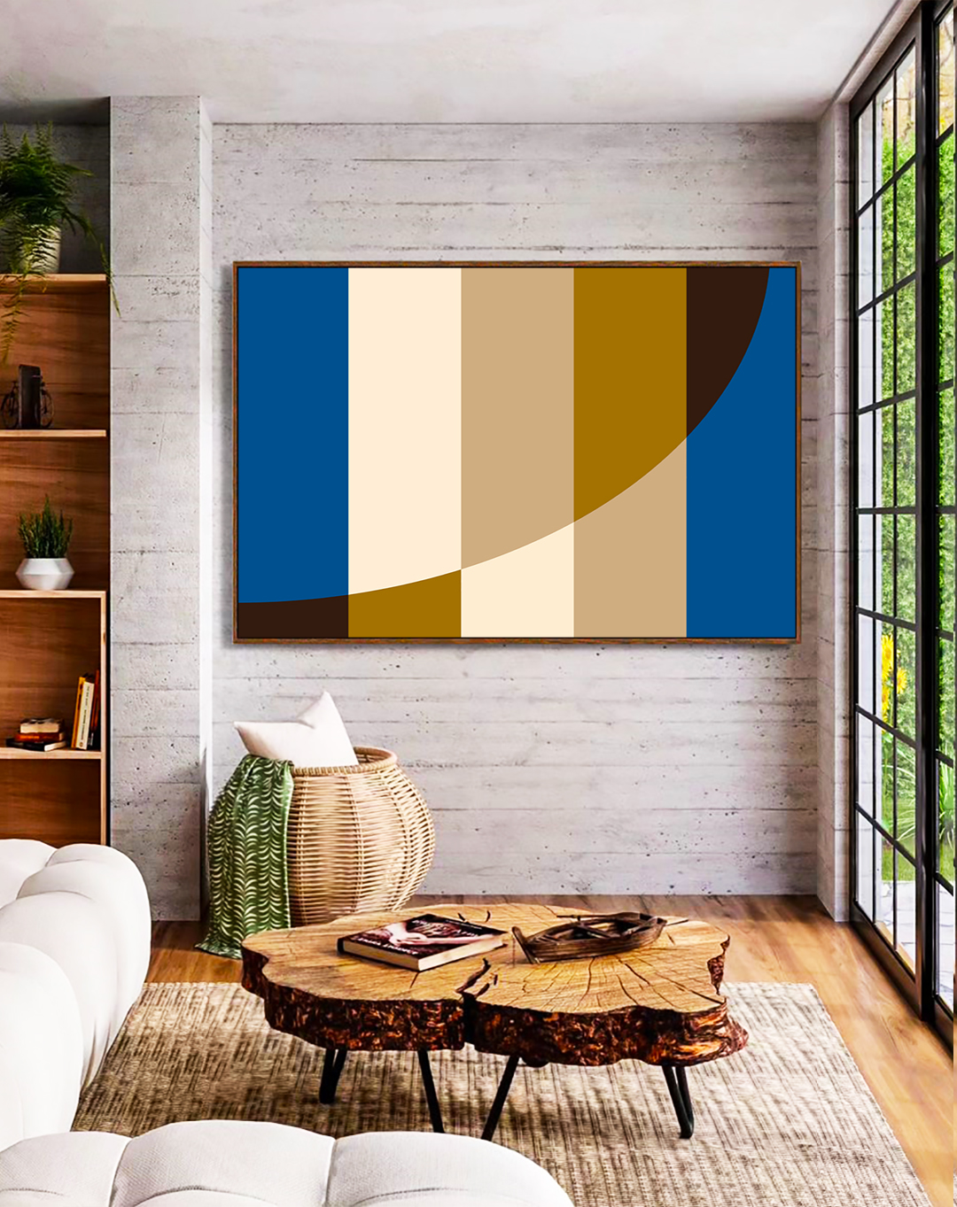 Este Quadro Horizontal combina formas geométricas e listras em azul e bege, transmitindo modernidade e sofisticação. A escolha ideal para decorar salas, quartos ou halls de entrada com estilo e personalidade. Formas e cores que inspiram.