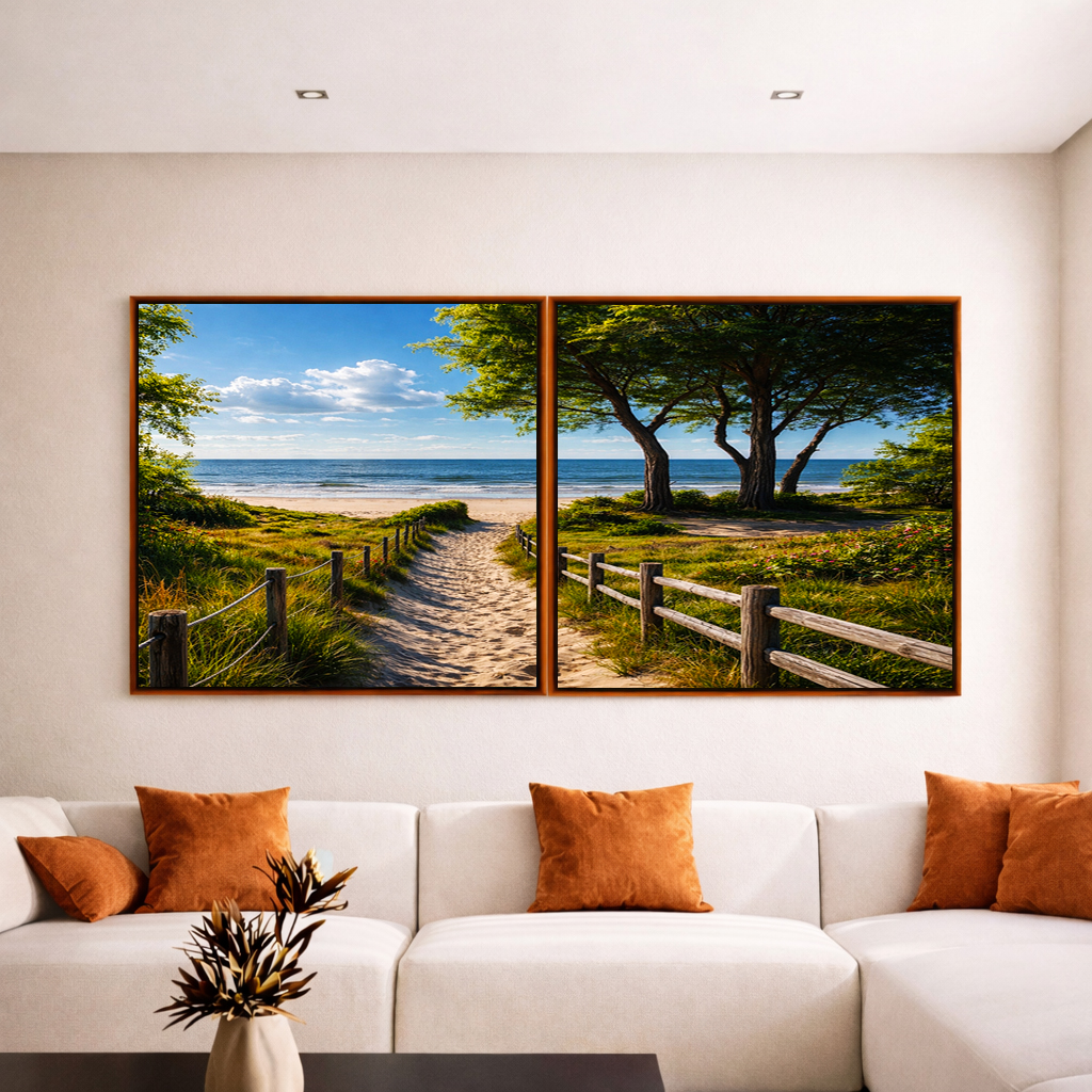 Estrada, árvores e mar se encontram em uma composição que transmite tranquilidade e profundidade. O Duo de Quadros Quadrados é ideal para decorar salas de estar, escritórios refinados ou quartos, trazendo arte paisagística e conexão com a natureza.