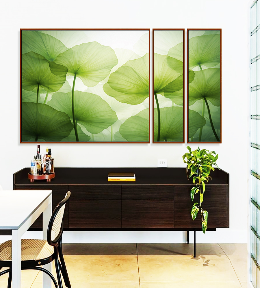 Folhas de lótus em verde suave, trazendo leveza e tranquilidade inspirada na natureza aquática. Ideal para sala, quarto ou espaços de descanso que pedem harmonia e serenidade.