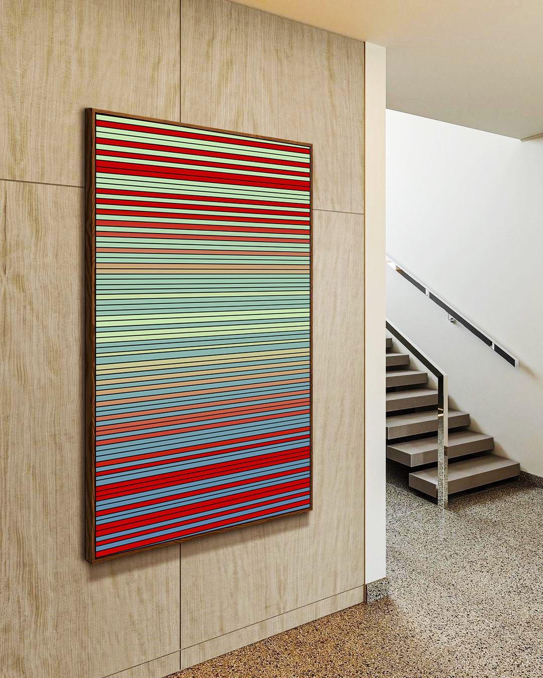 Quadro vertical com degradê de listras em verde menta, vermelho tijolo e azul. Sua moldura flutuante valoriza qualquer espaço, ideal para decorar salas, quartos ou halls de entrada, adicionando harmonia, cor e sofisticação ao ambiente.