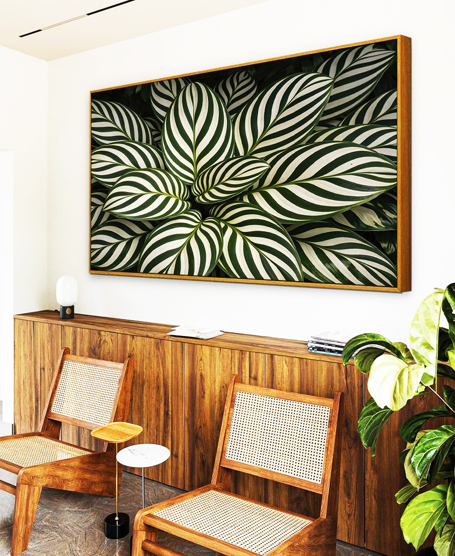 Natural e marcante, este Quadro Horizontal com calatheas em destaque cria ponto focal elegante e conexão com a natureza ao ambiente. Ideal para compor salas modernas, quartos elegantes ou halls de entrada de destaque.