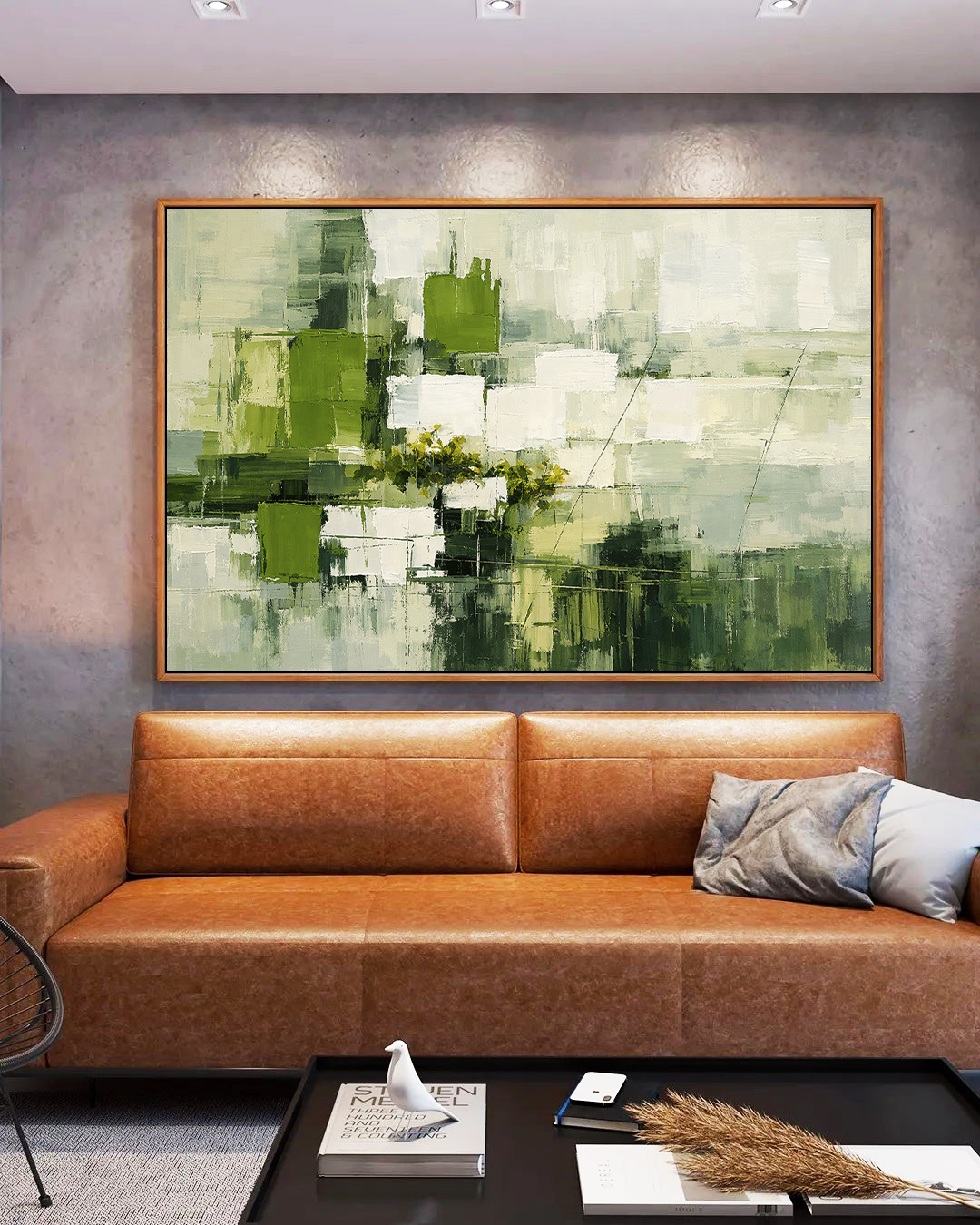 Tons de verde e cinza em efeito de pintura abstrata criam atmosfera moderna e sofisticada. Ideal para decorar salas, quartos, escritórios, consultórios. Combina com decoração contemporânea, minimalista e paletas neutras.