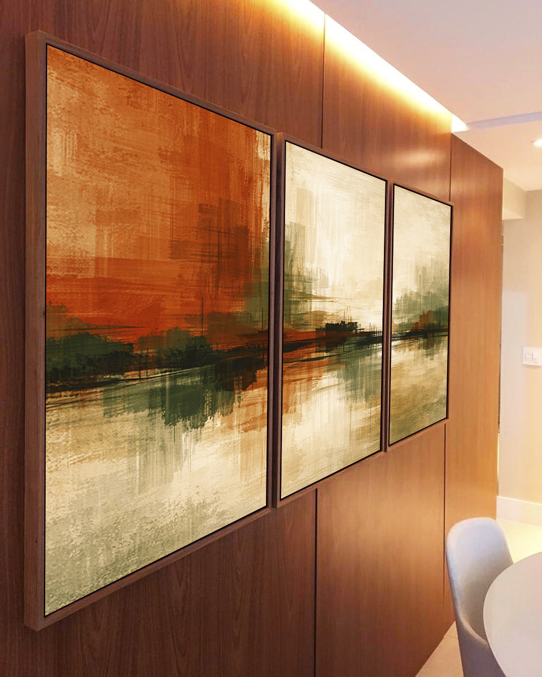 Tons de cobre, verde oliva, areia e creme criam uma atmosfera sofisticada e acolhedora. Ideal para salas, escritórios e ambientes que valorizam equilíbrio, elegância e uma estética natural contemporânea.