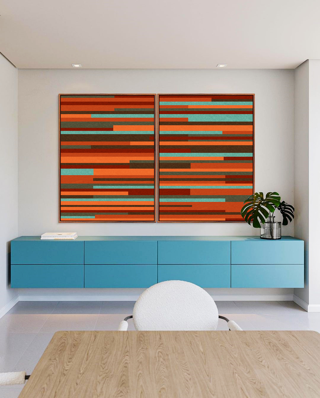 Acrescente elegância ao seu ambiente com este Duo de Quadros abstratos, com mosaico de listras laranja, verde e turquesa. Perfeito para salas e escritórios contemporâneos. Produzidos com canvas durável e moldura sofisticada que realça o seu espaço.