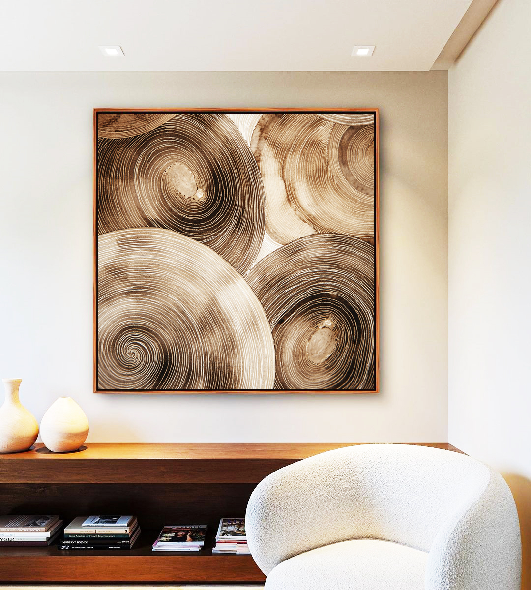 Moderno e envolvente, este Quadro Quadrado com formas circulares em marrom e bege traz profundidade visual e design elegante. A escolha certa para iluminar salas amplas, quartos refinados ou escritórios contemporâneos.