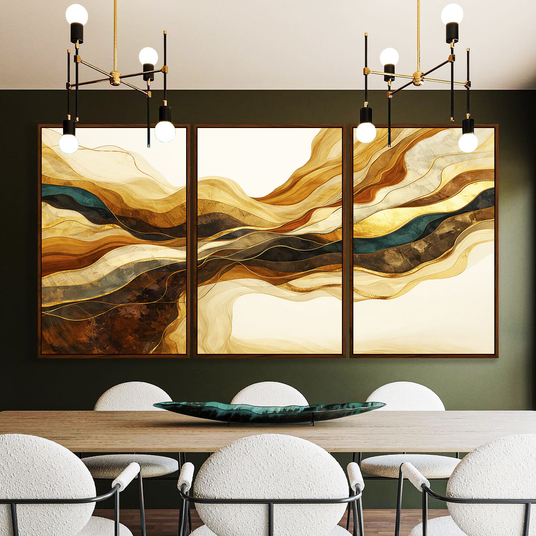 Arte fluida abstrata com ondulações em amarelo mostarda, bronze e azul, criando movimento e elegância visual. Ideal para decoração de sala de estar, escritório, quartos ou ambientes modernos que buscam cor, sofisticação e destaque.