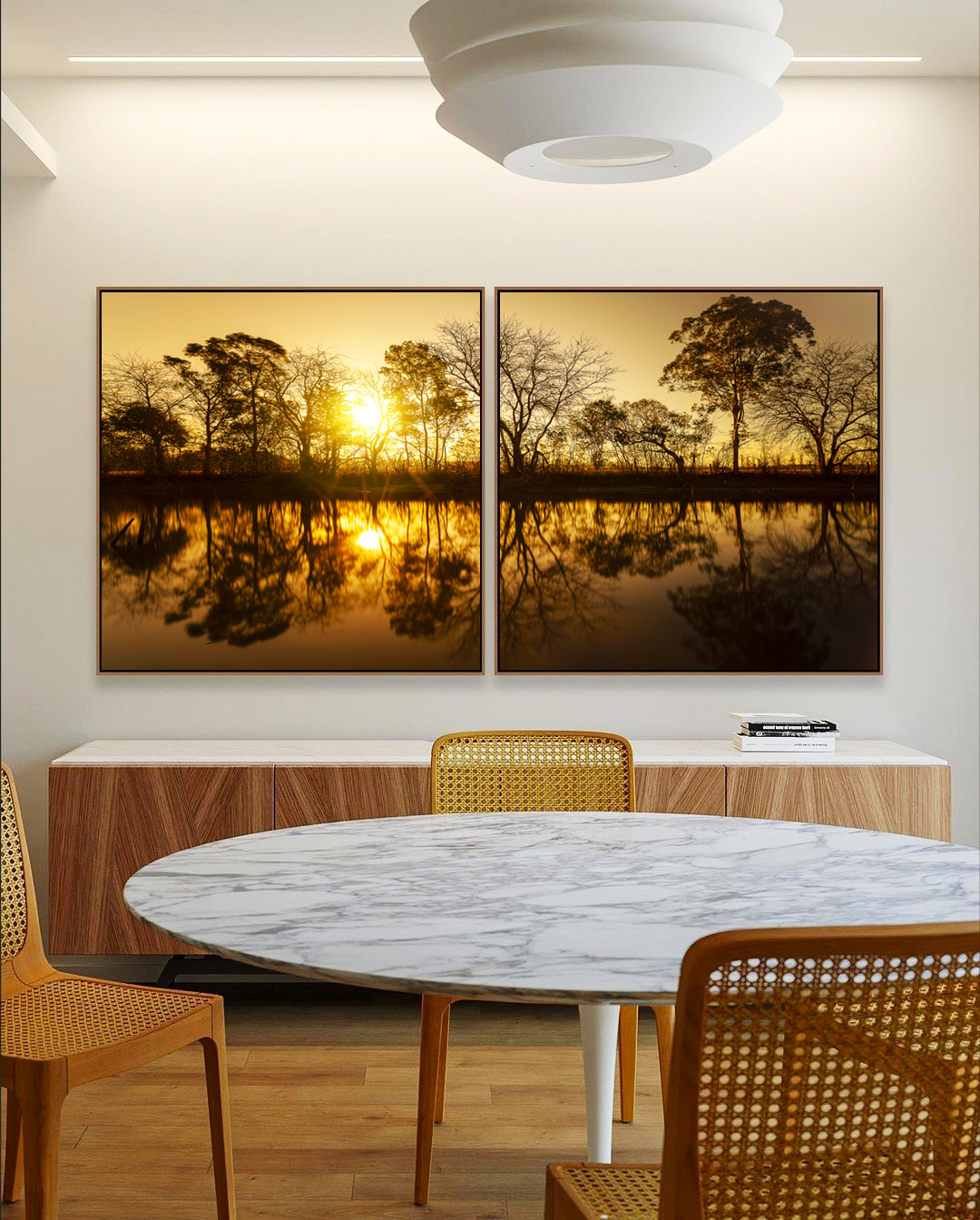 Ilumine sua decoração com este Duo de Quadros Quadrados Harmonioso. O reflexo da natureza no lago ao pôr do sol cria um ambiente sereno e requintado. Perfeito para salas, quartos e escritórios. Impressão premium em tela canvas com moldura resistente e elegante.