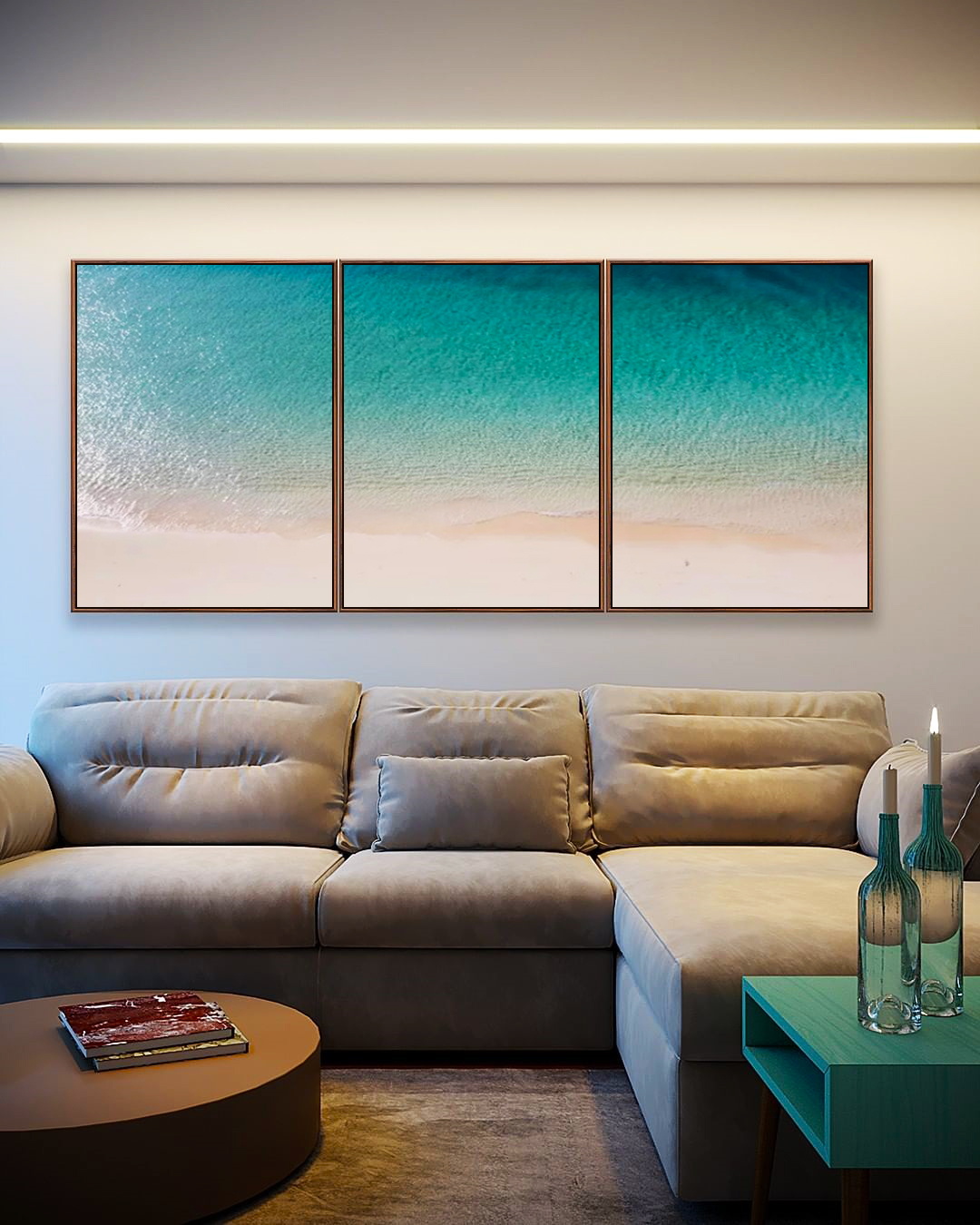 Crie uma atmosfera relaxante com este Trio de Quadros em tons de azul turquesa e areia clara. Perfeito para ambientes tropicais e modernos. Impressão premium sobre tela canvas com moldura resistente e refinada.