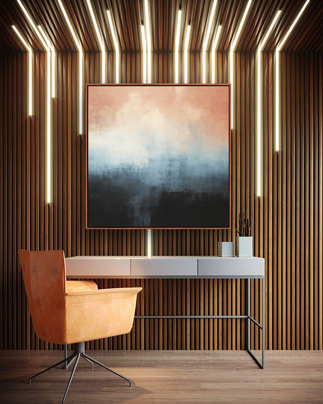 Delicadeza e intensidade se encontram neste Quadro Quadrado abstrato que mescla rosa antigo e azul escuro em um degradê artístico. Um Quadro elegante e atemporal, ideal para realçar sua sala, quarto ou hall com sofisticação contemporânea.