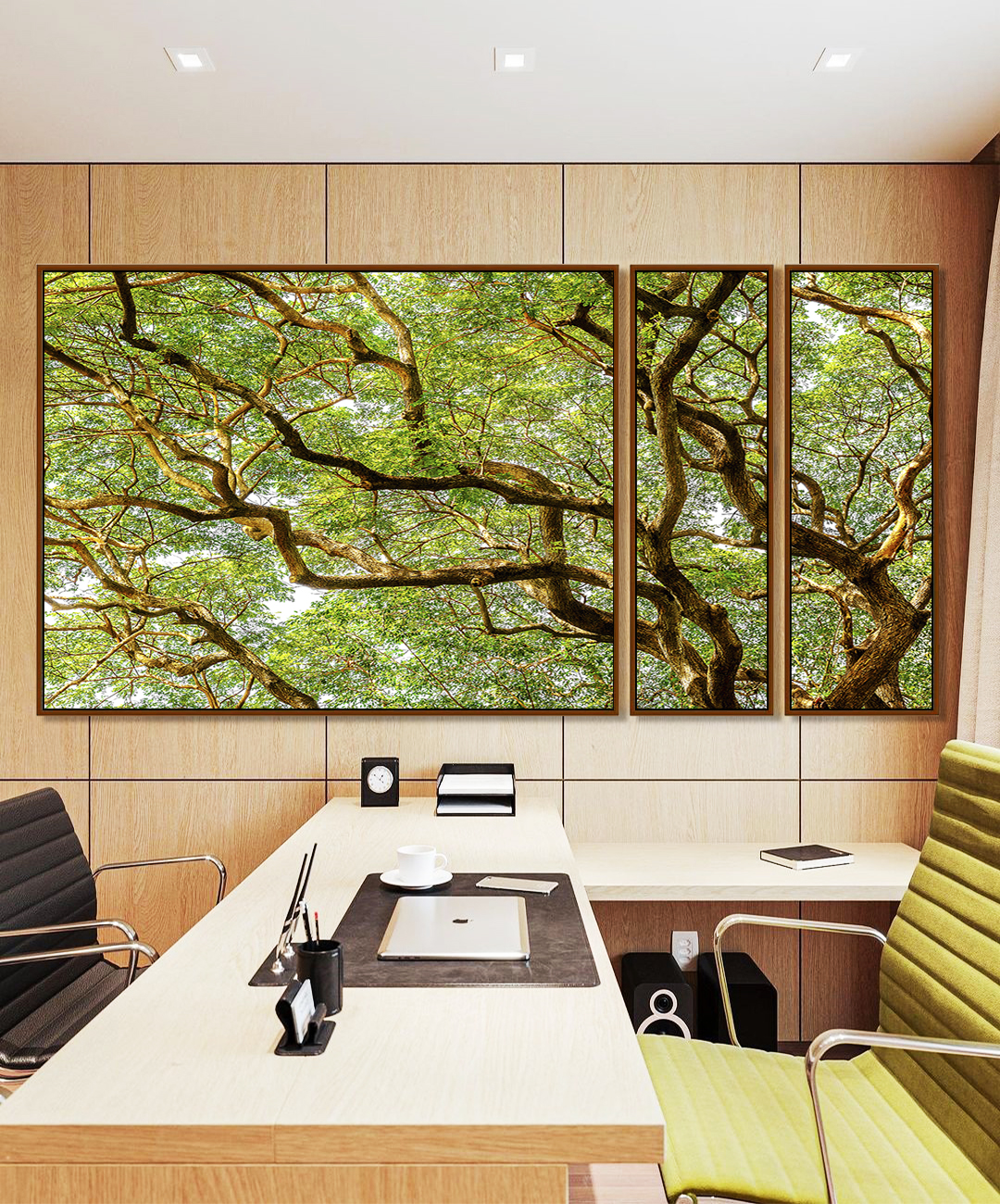Eleve sua decoração com este Trio de Quadros Estilizados da natureza, exibindo copa de árvore e folhas em detalhes únicos. Perfeito para seu Quarto, Sala ou Hall de entrada, criando um ambiente sereno e cheio de elegância. Moldura Flutuante de Excelente Qualidade!