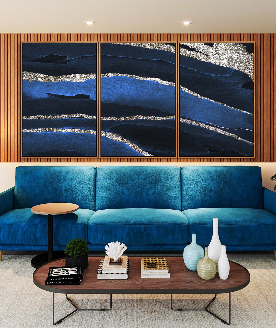 Trio de Quadros abstratos em azul e prateado com textura artística envolvente. Moldura flutuante em canvas valoriza os detalhes, ideal para transformar salas, escritórios ou halls de entrada em ambientes modernos, sofisticados e cheios de estilo.