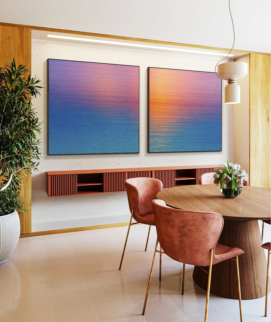 Delicado e marcante, este Duo de Quadros Quadrados de natureza com mar azul e céu rosa ao pôr do sol cria ponto focal elegante. Ideal para compor salas sofisticadas, quartos estilosos, escritórios modernos ou halls de entrada de destaque.