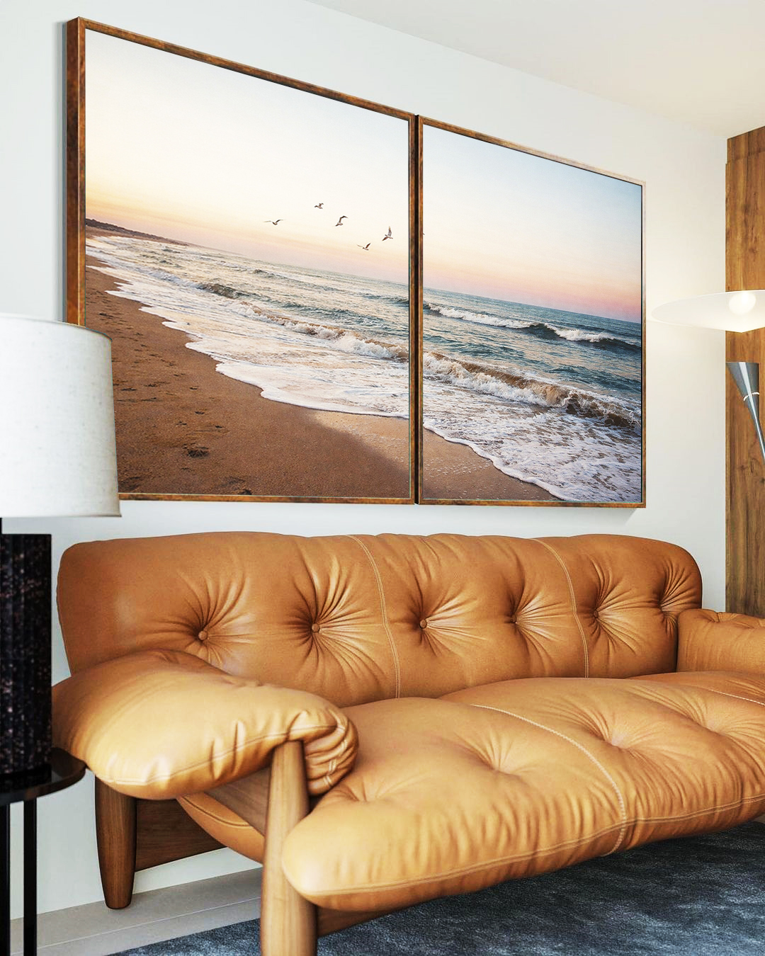O encontro do mar com o céu claro alaranjado e pássaros em movimento cria uma cena acolhedora e inspiradora. O Duo de Quadros é ideal para decorar salas de estar, escritórios ou quartos, trazendo tranquilidade e sensação de horizonte aberto.