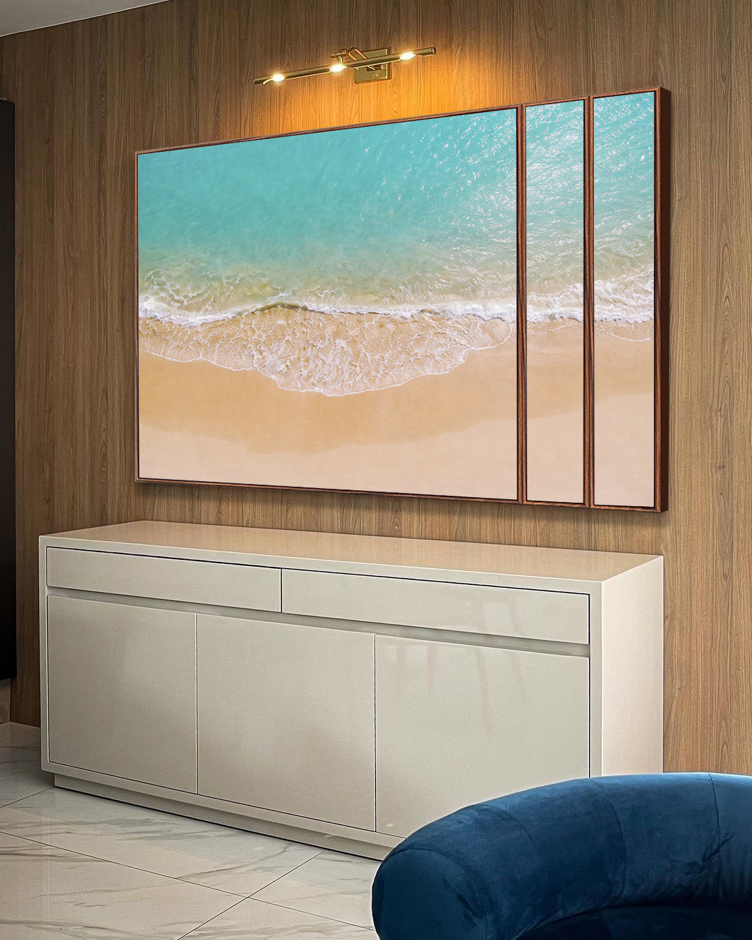 Mar azul turquesa brilhando sob a luz do sol, cenário de praia clara que transmite calma, frescor e liberdade. Perfeito para sala de estar, quarto, hall, consultório ou ambientes de decoração praiana, tropical, contemporânea ou minimalista.