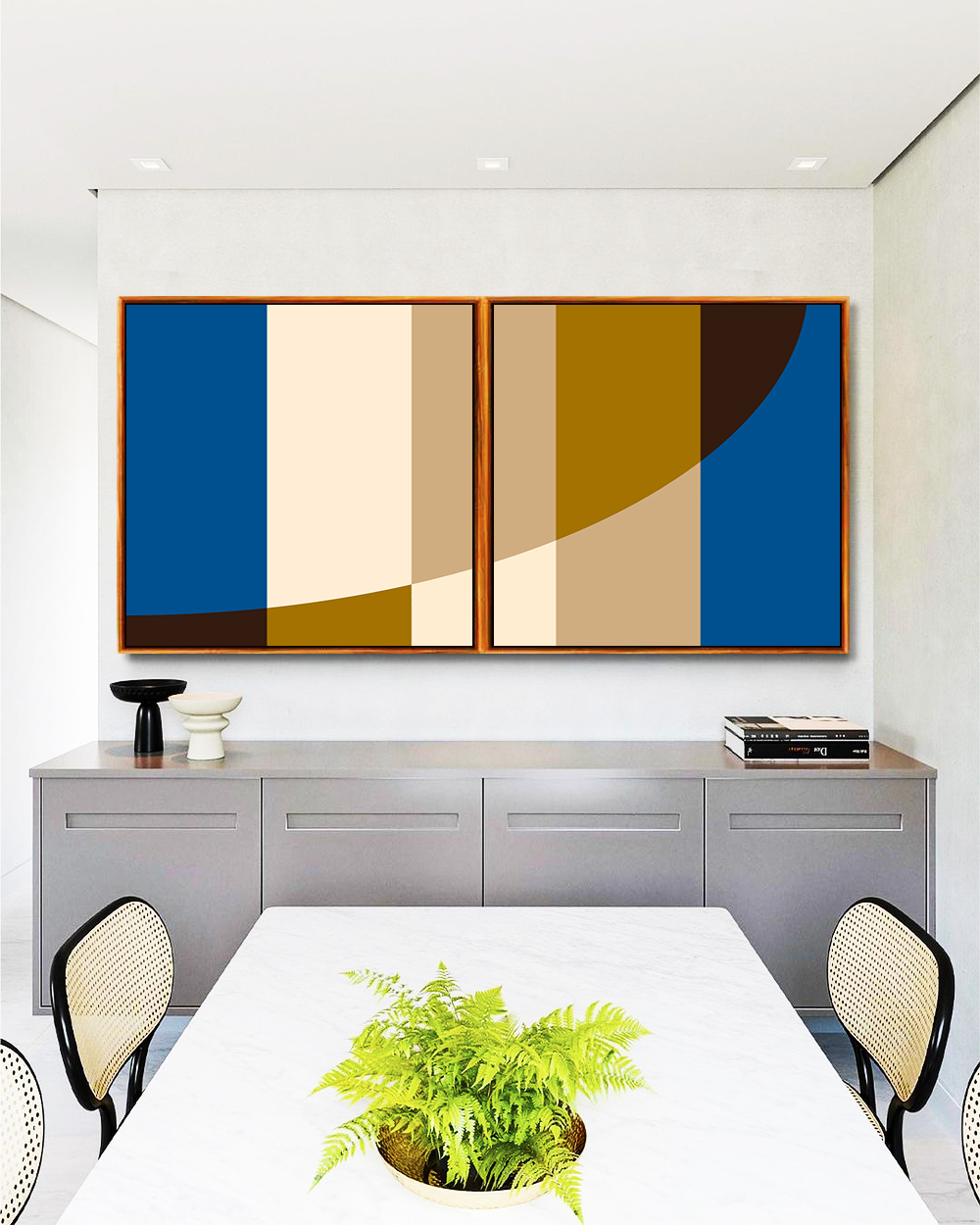 Este Duo de Quadros Quadrados combina formas geométricas e listras em azul e bege, transmitindo modernidade e sofisticação. A escolha ideal para decorar salas, quartos ou halls de entrada com estilo e personalidade. Formas e cores que inspiram.