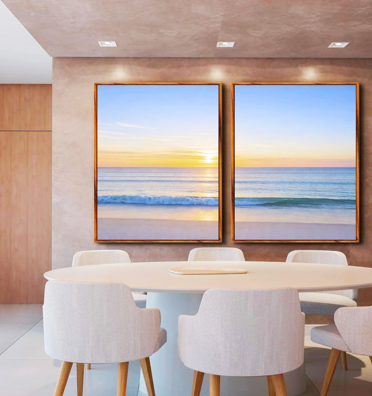 Leve e inspirador, este Duo de Quadros retrata a natureza litorânea com mar azul claro e céu aberto ao nascer do sol, arte cheia de harmonia. A escolha ideal para quartos tranquilos, escritórios sofisticados ou salas elegantes.