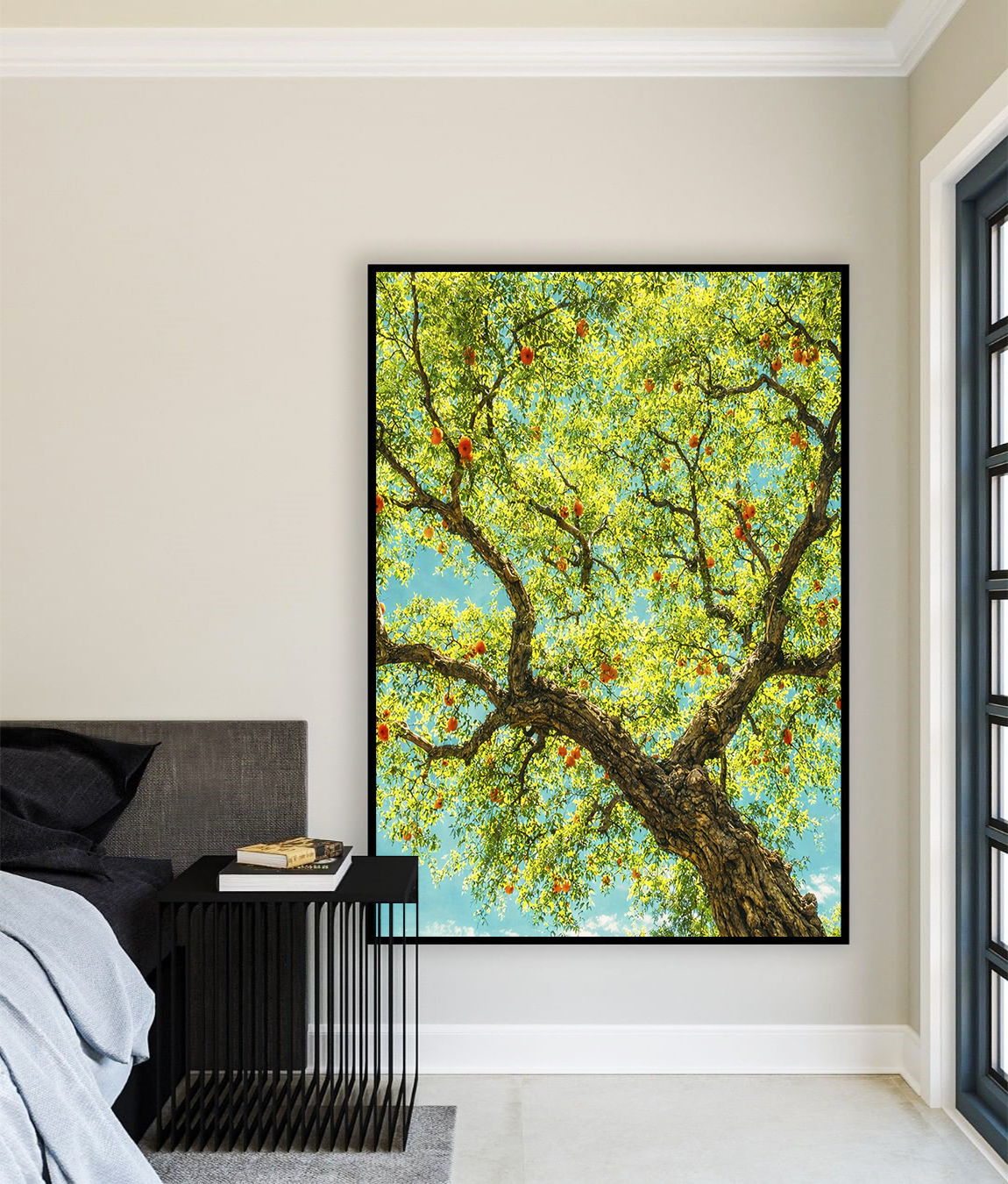 O contraste da árvore frutífera com o céu azul turquesa cria uma composição alegre e envolvente. Este Quadro Vertical é ideal para salas elegantes, quartos acolhedores ou escritórios modernos, trazendo uma atmosfera positiva ao ambiente.