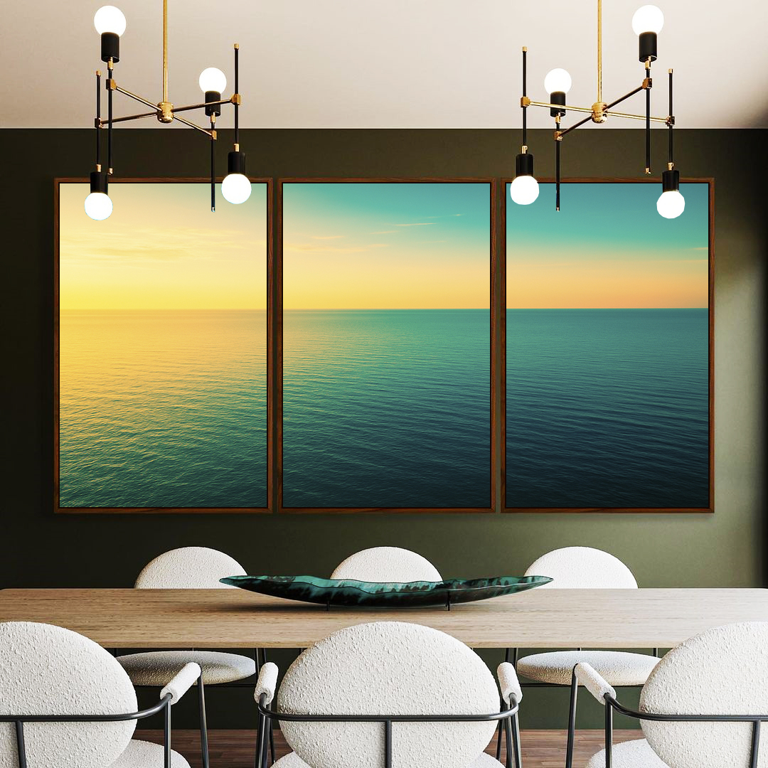 O equilíbrio entre o mar turquesa sereno e o pôr do sol cria uma atmosfera de paz e harmonia. Este Trio de Quadros é a escolha certa para decorar salas, escritórios ou quartos com elegância natural e beleza atemporal.