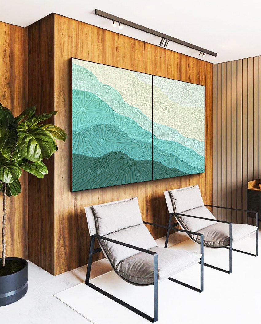 Com degradê abstrato em marfim e turquesa, a textura cria profundidade e sensação de frescor. Este Duo de Quadros é ideal para salas elegantes, quartos contemporâneos ou escritórios sofisticados, elevando o ambiente com equilíbrio visual.