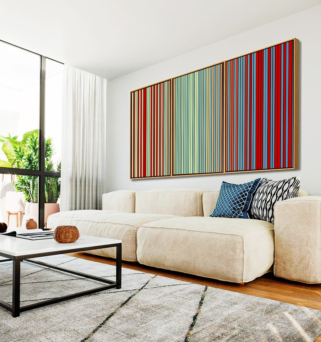 Trio de Quadros abstratos com listras em verde menta, vermelho tijolo e azul, em degrade elegante. Com moldura moderna, valoriza salas, escritórios ou quartos, oferecendo estilo, sofisticação e impacto visual marcante para a decoração.