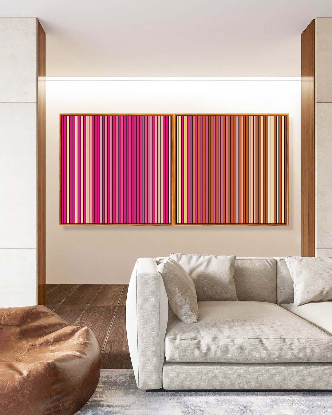 Com linhas modernas e cores elegantes, este Duo de Quadros Quadrados em degradê rosa choque, bege e caramelo leva requinte aos ambientes. Sua moldura moderna realça salas, halls e escritórios, destacando a decoração com estilo artístico.