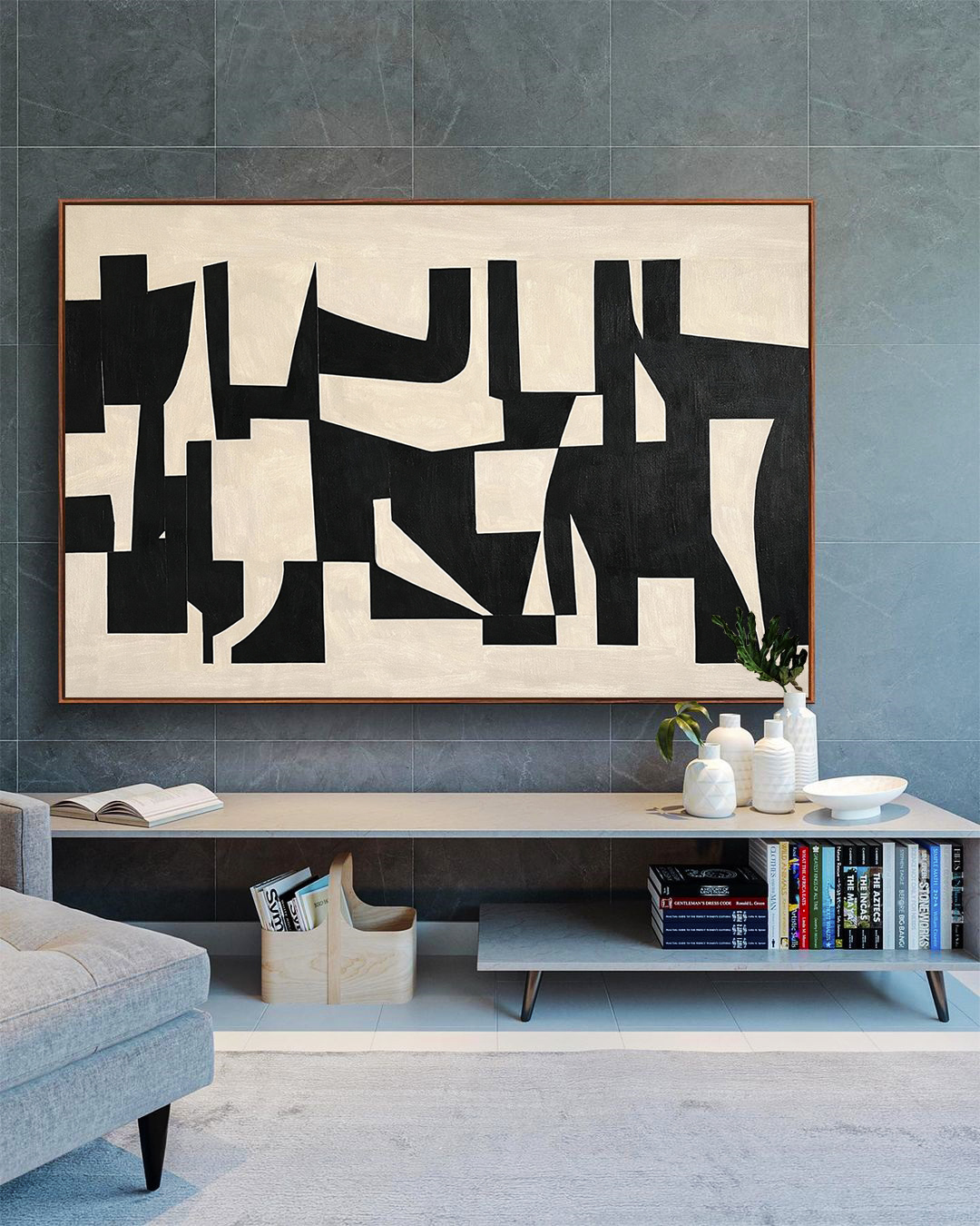 Traços minimalistas e geométricos em preto e marfim criam um visual elegante e equilibrado. Ideal para salas, escritórios e ambientes que buscam sofisticação, ordem visual e estética contemporânea.