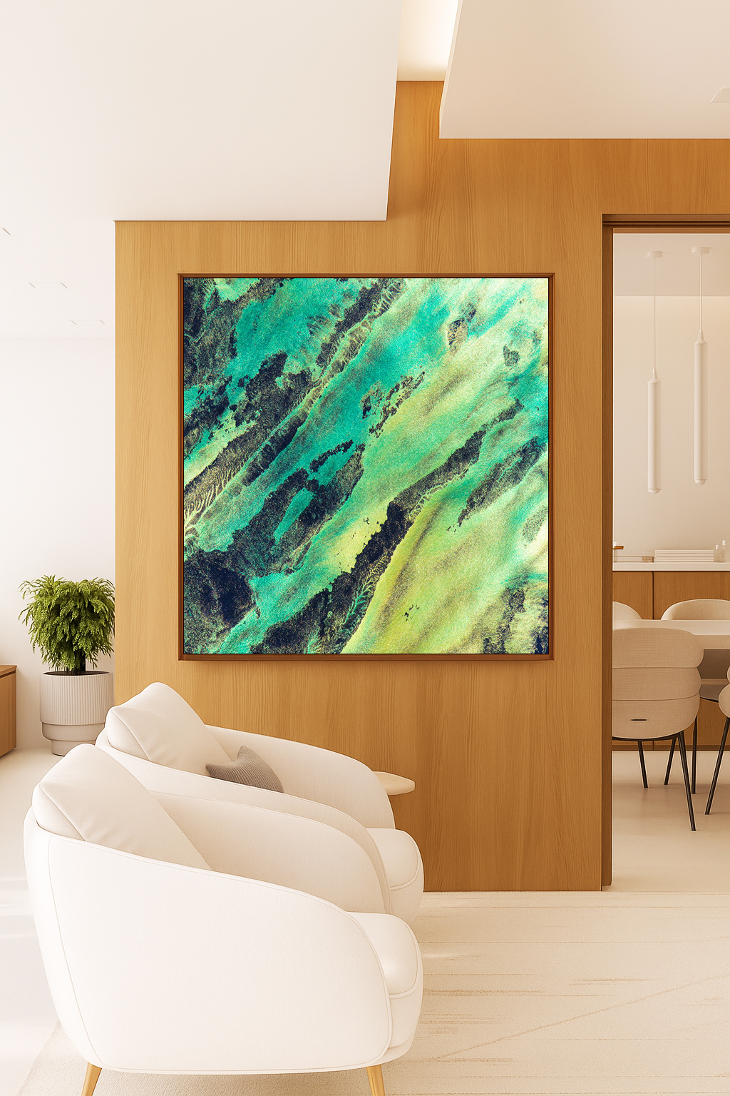 Com nuances de cinza e toques vibrantes de verde turquesa, este Quadro Quadrado traz frescor e estilo contemporâneo ao ambiente. A escolha certa para realçar salas, quartos ou escritórios com arte abstrata marcante e visualmente harmoniosa.