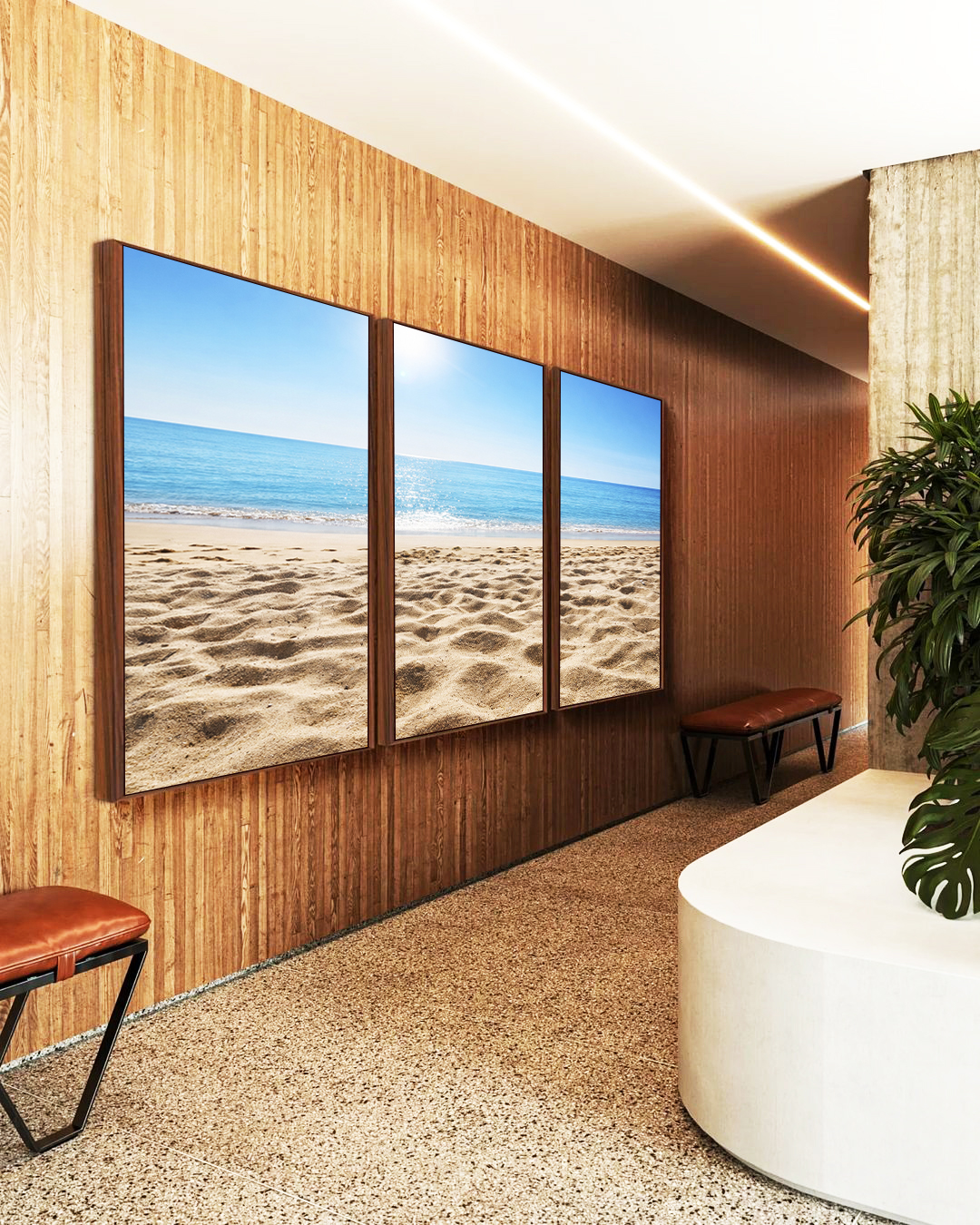 O brilho suave do sol refletindo no mar traz harmonia e aconchego ao espaço. Ótimo para quartos, salas de estar, consultórios ou cantinhos de relaxamento. Belíssimo!
